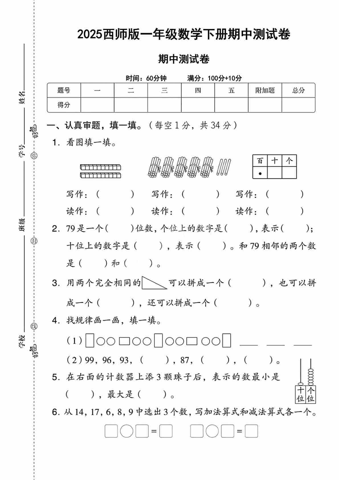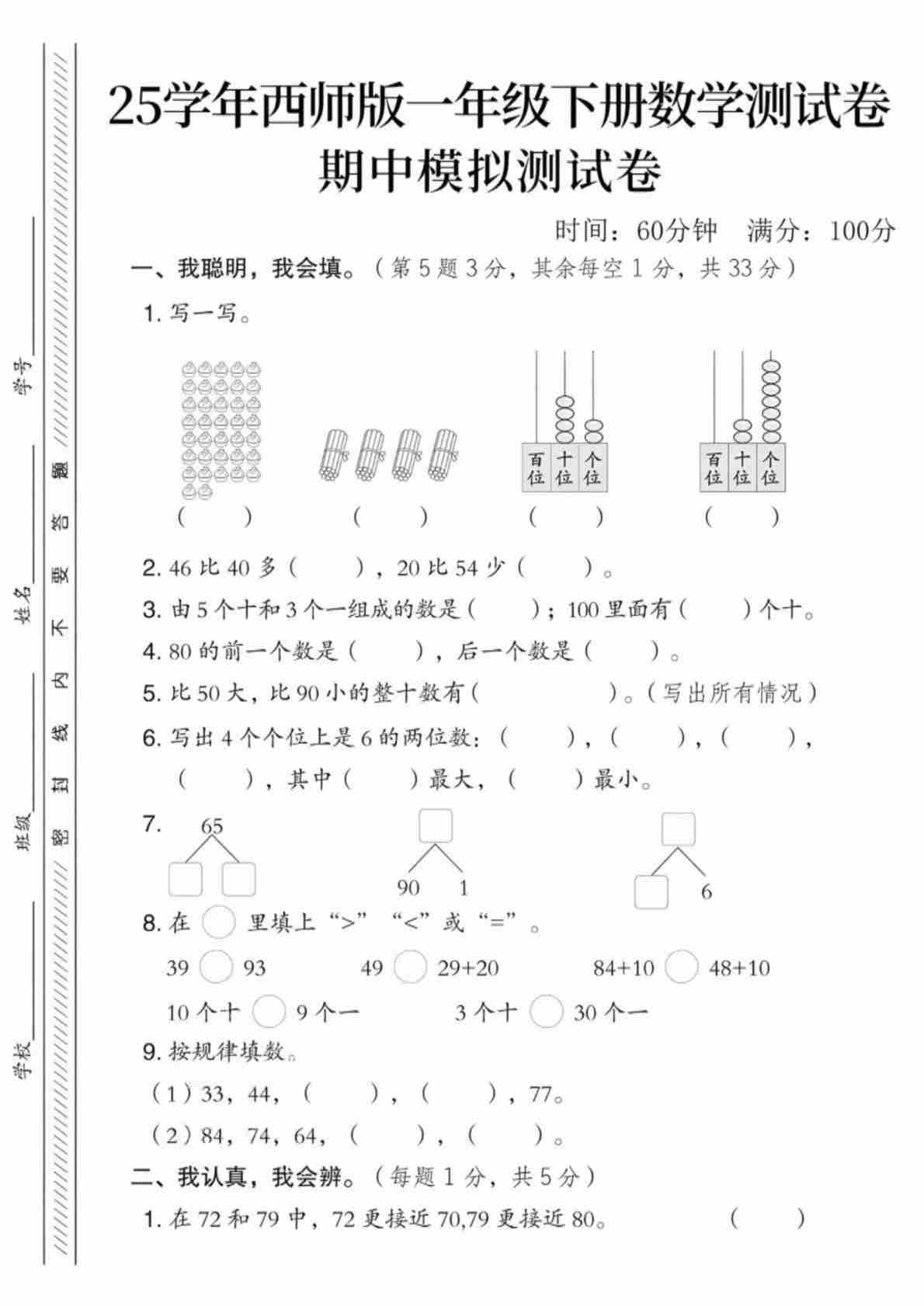 一(下)数学25春西师版1-3单元测试卷+期中试卷(好卷)