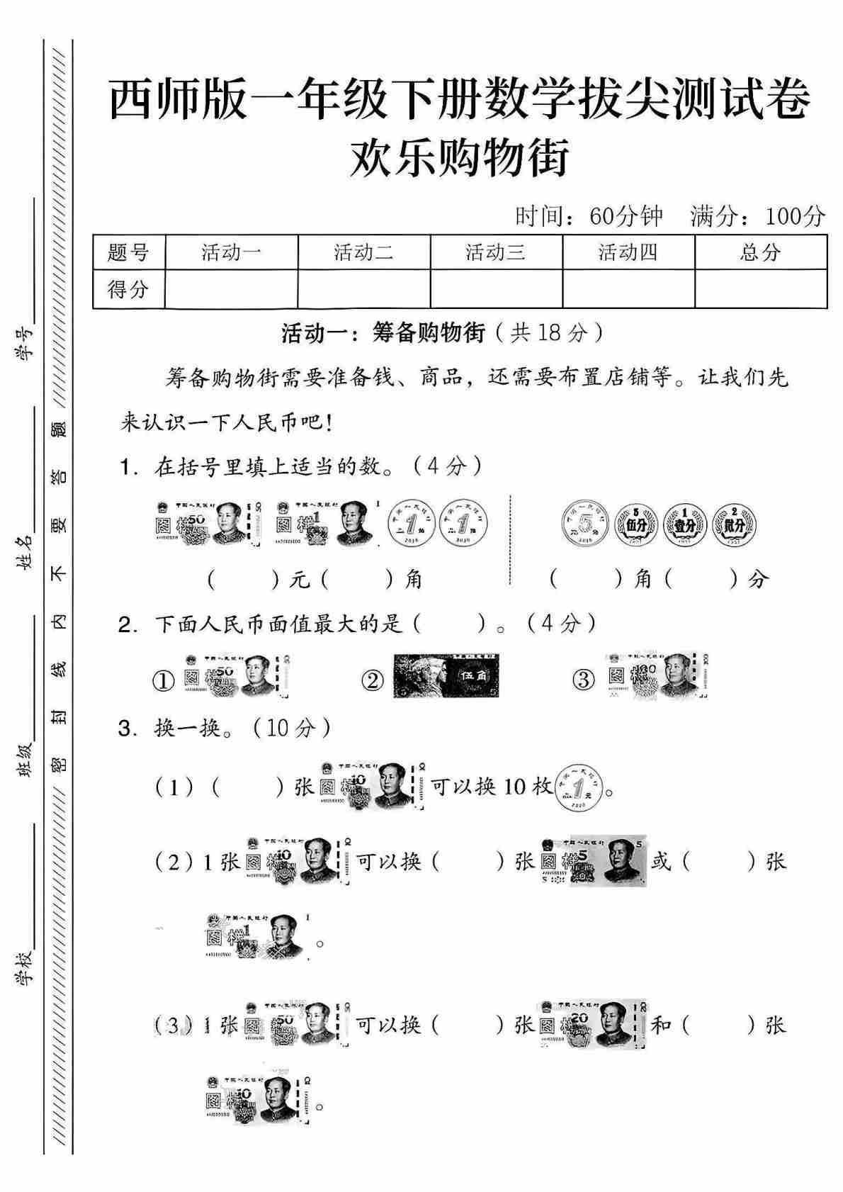 一年级(下)数学 欢乐购物街拔尖测试卷《西师版》