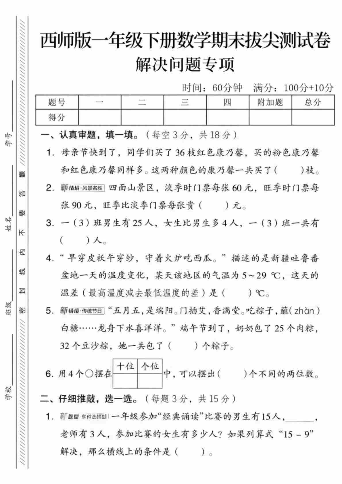 一年级(下)数学 解决问题专项拔尖测试卷《西师版》