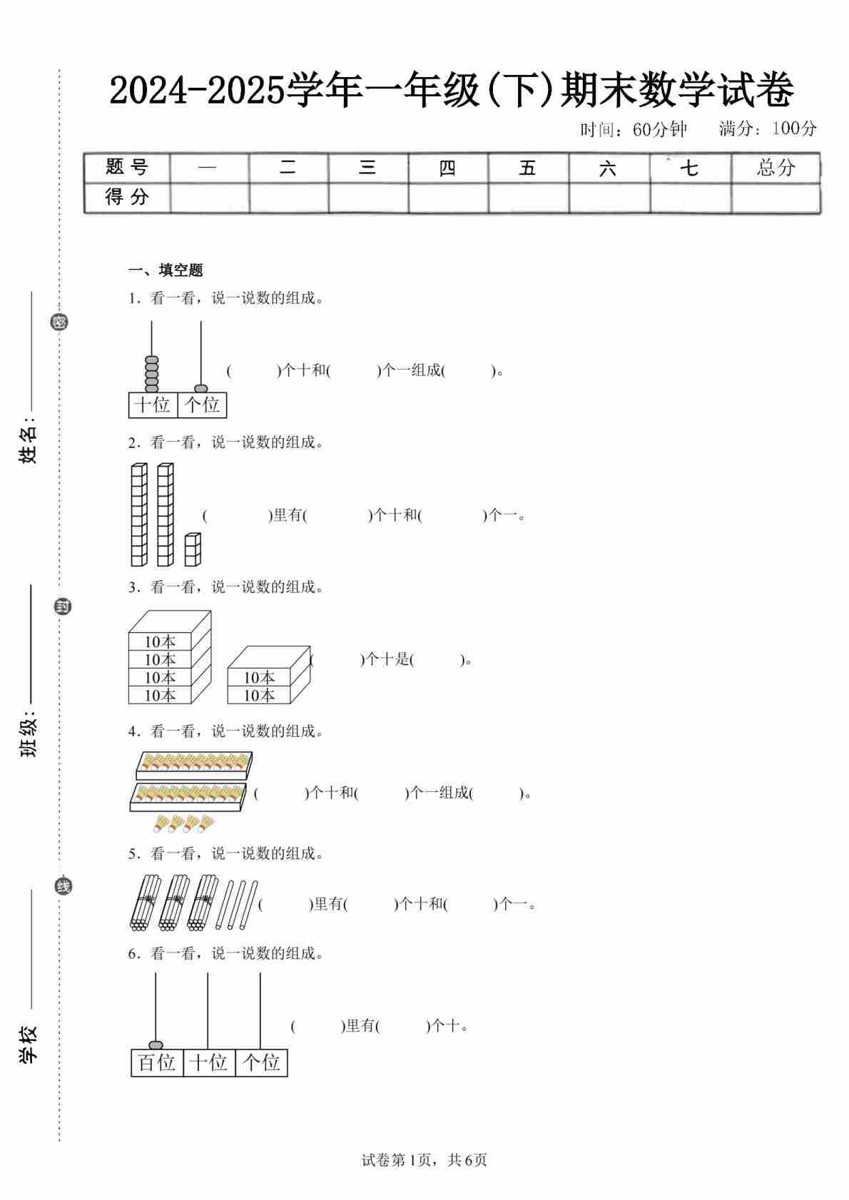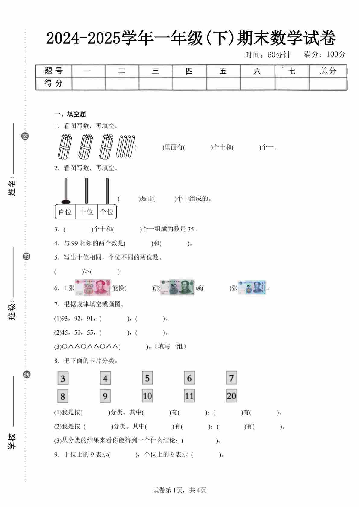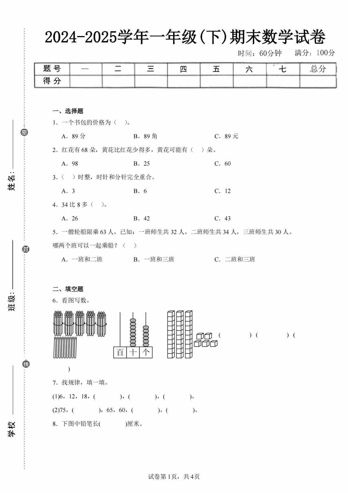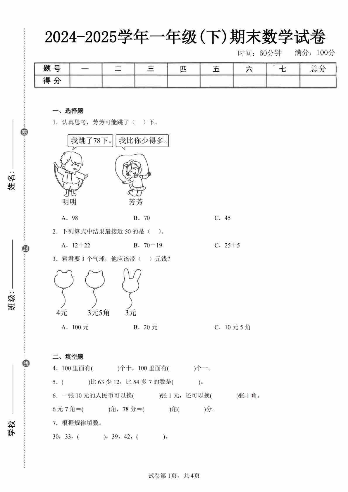 一(下)数学24-25学年西师版期末试卷四(含答案解析10页)