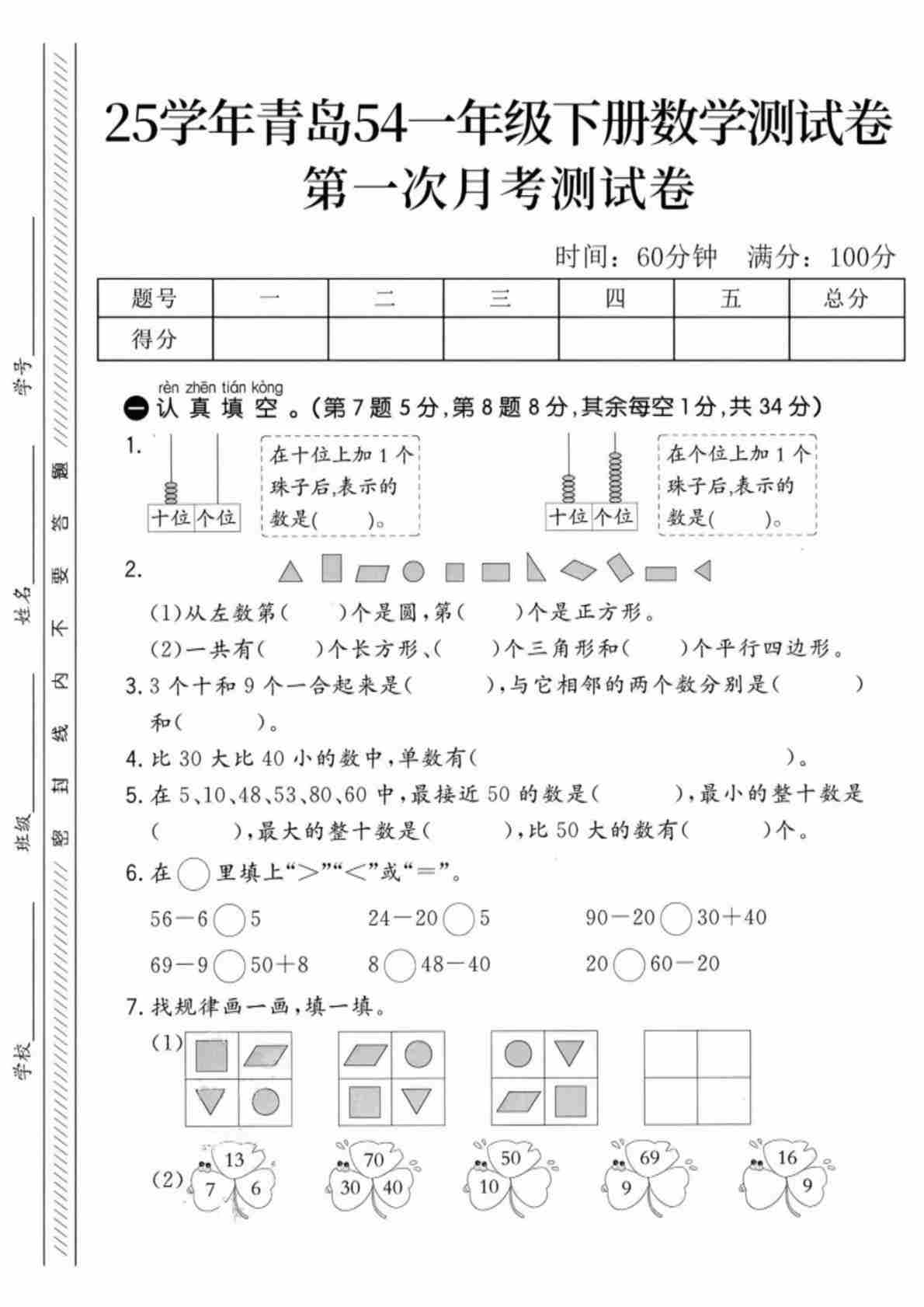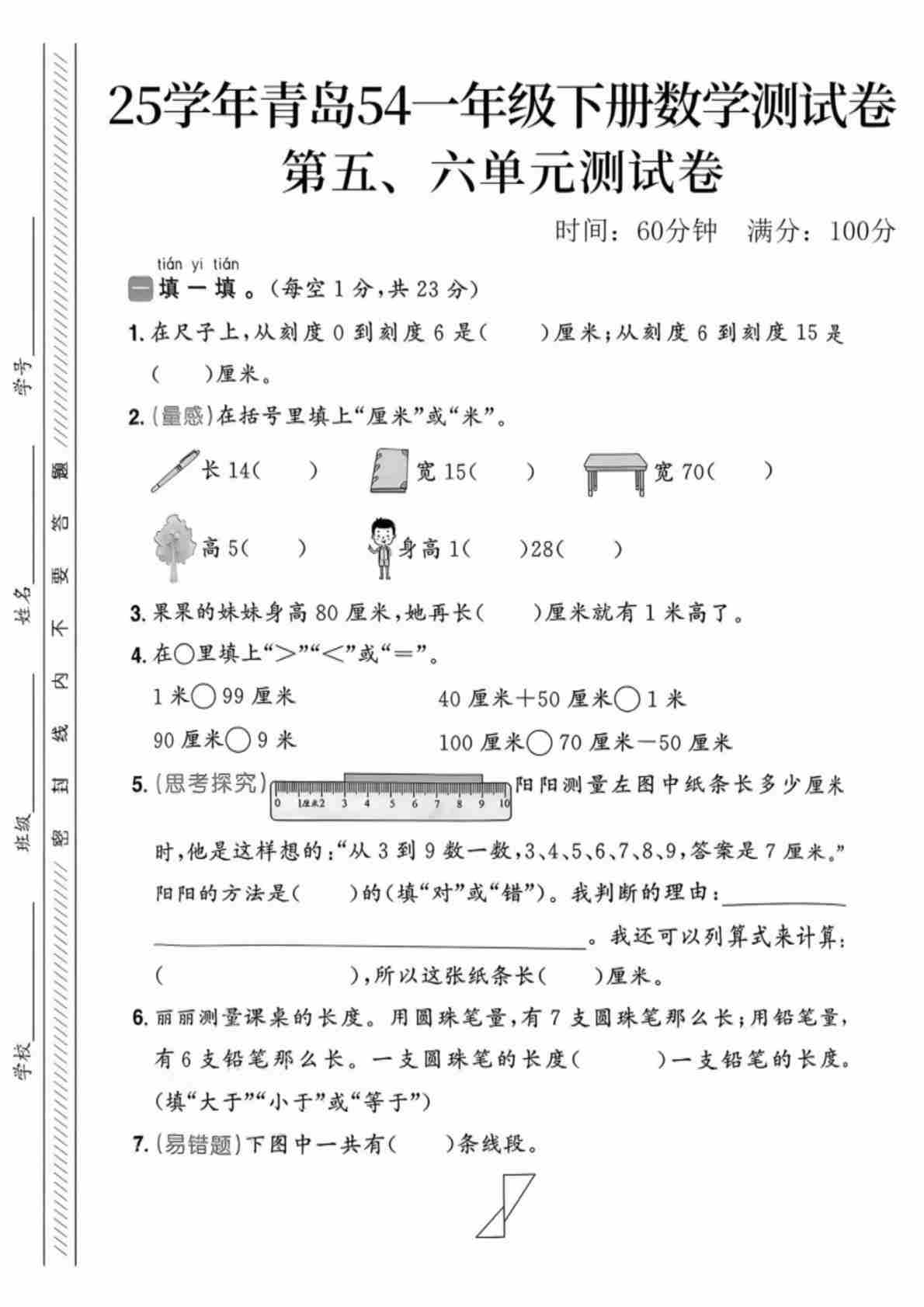 一年级(下)数学 第五,六单元测试卷《青岛54》