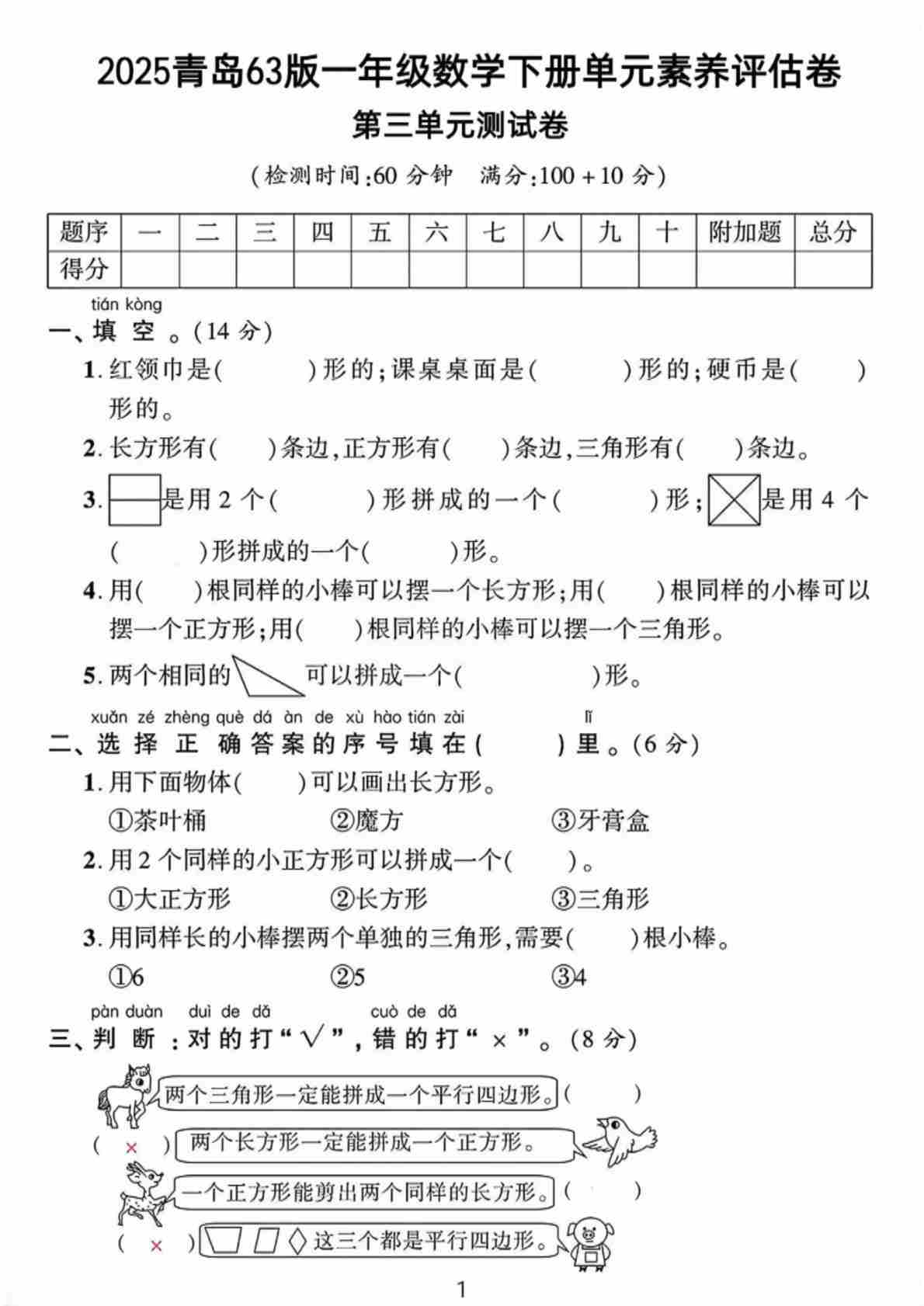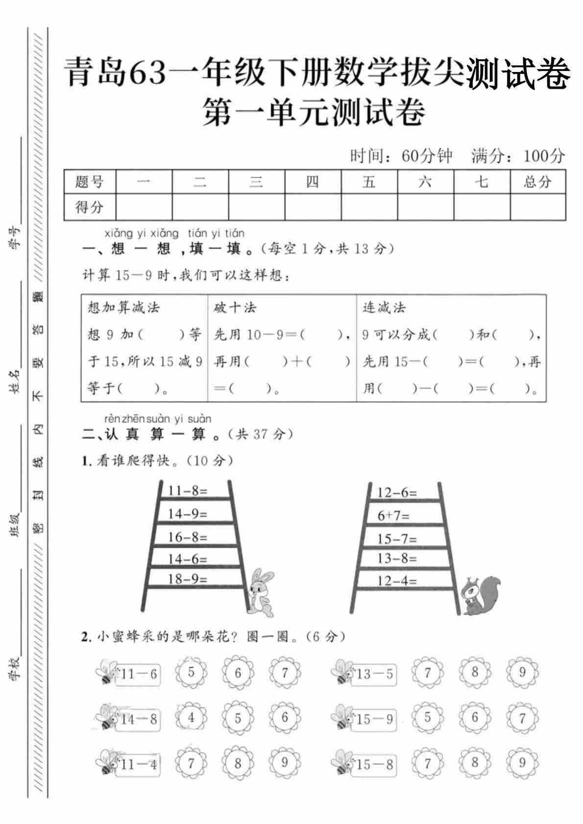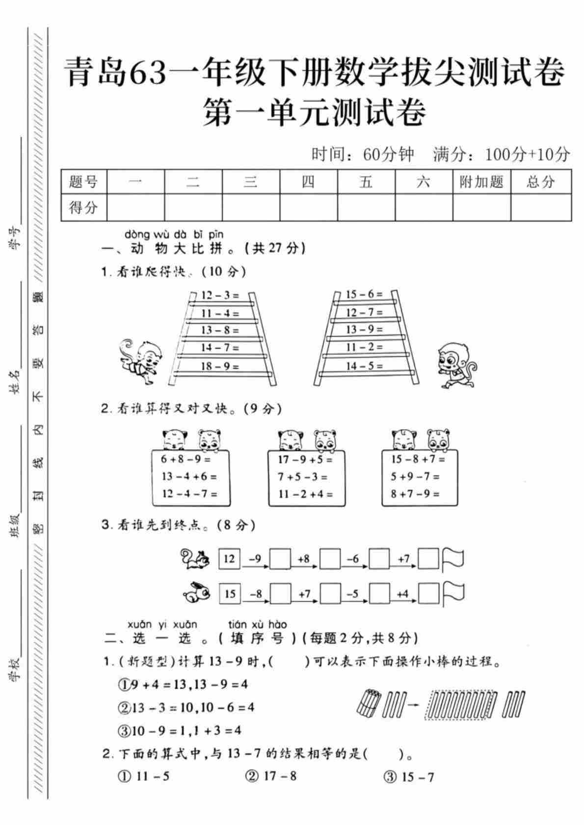 25年一年级(下)数学第一单元拔尖测试卷.2《青岛63版》