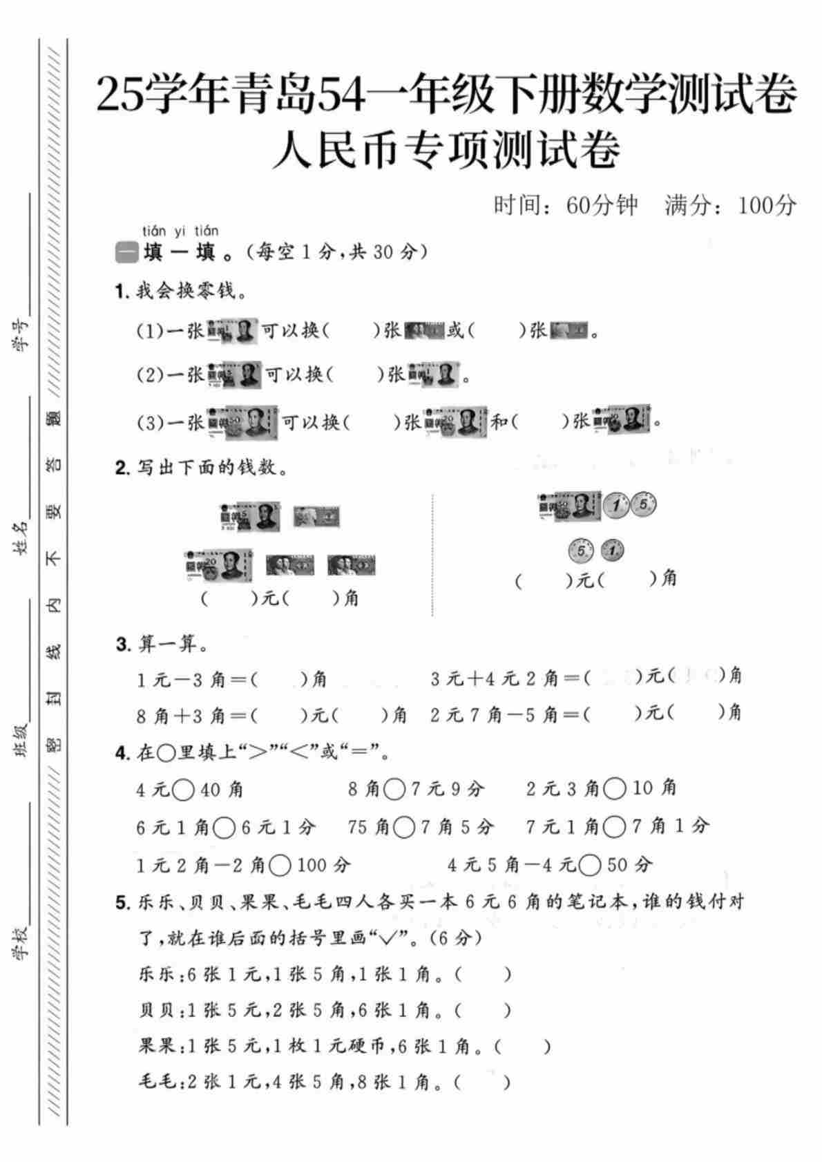 一年级(下)数学 人民币专项测试卷《青岛54》