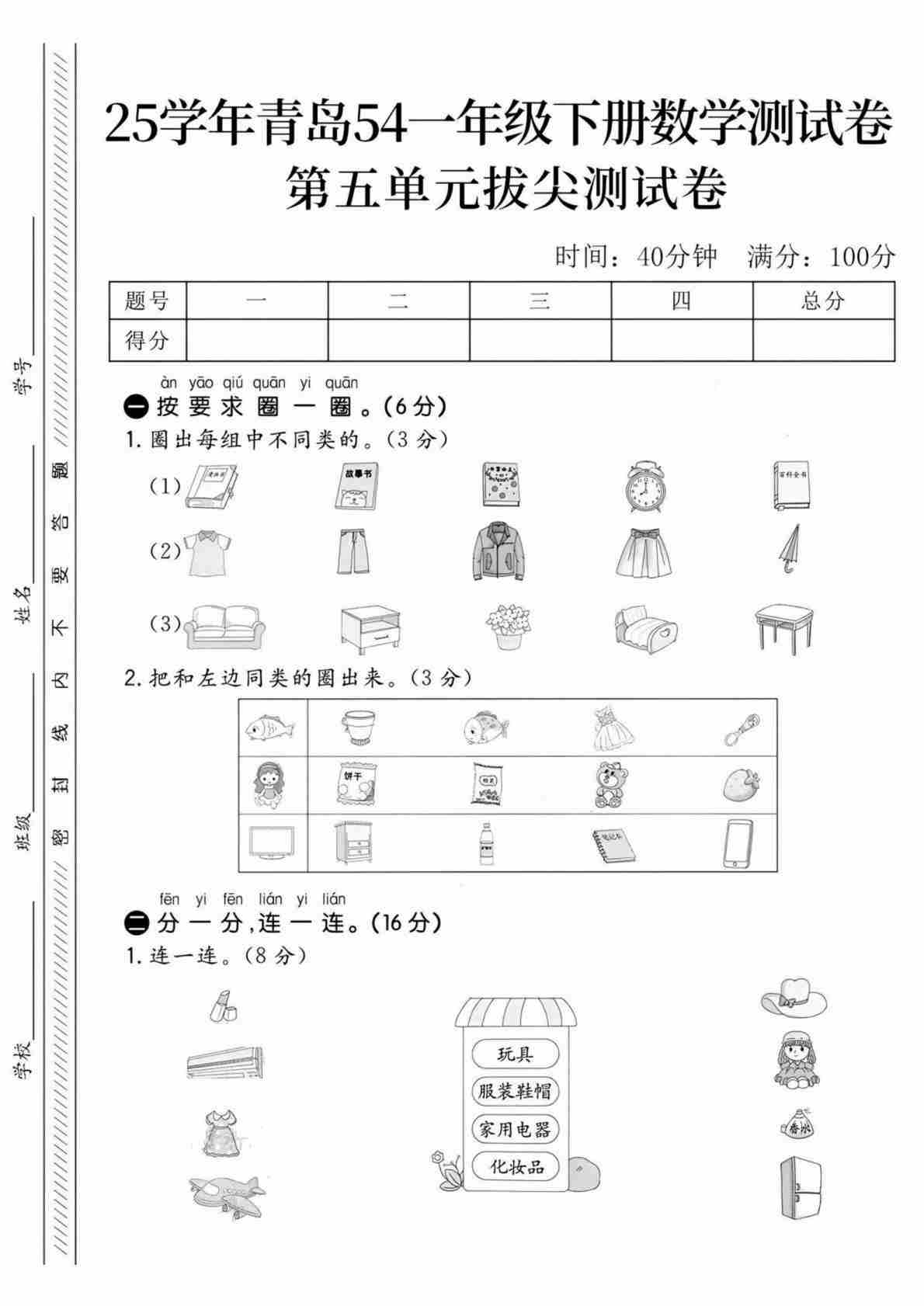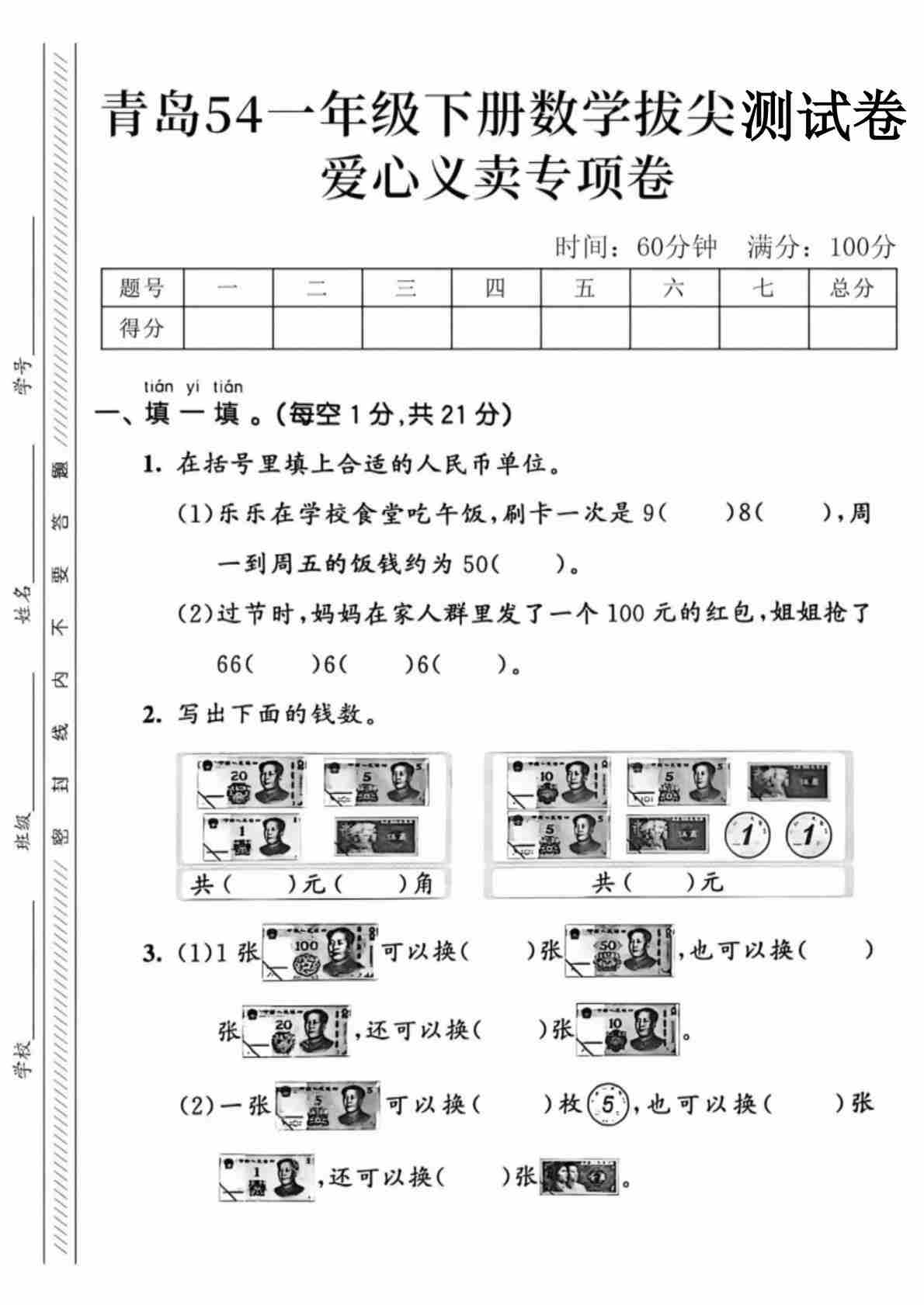 一年级(下)数学 爱心义卖专项卷《青岛54版》