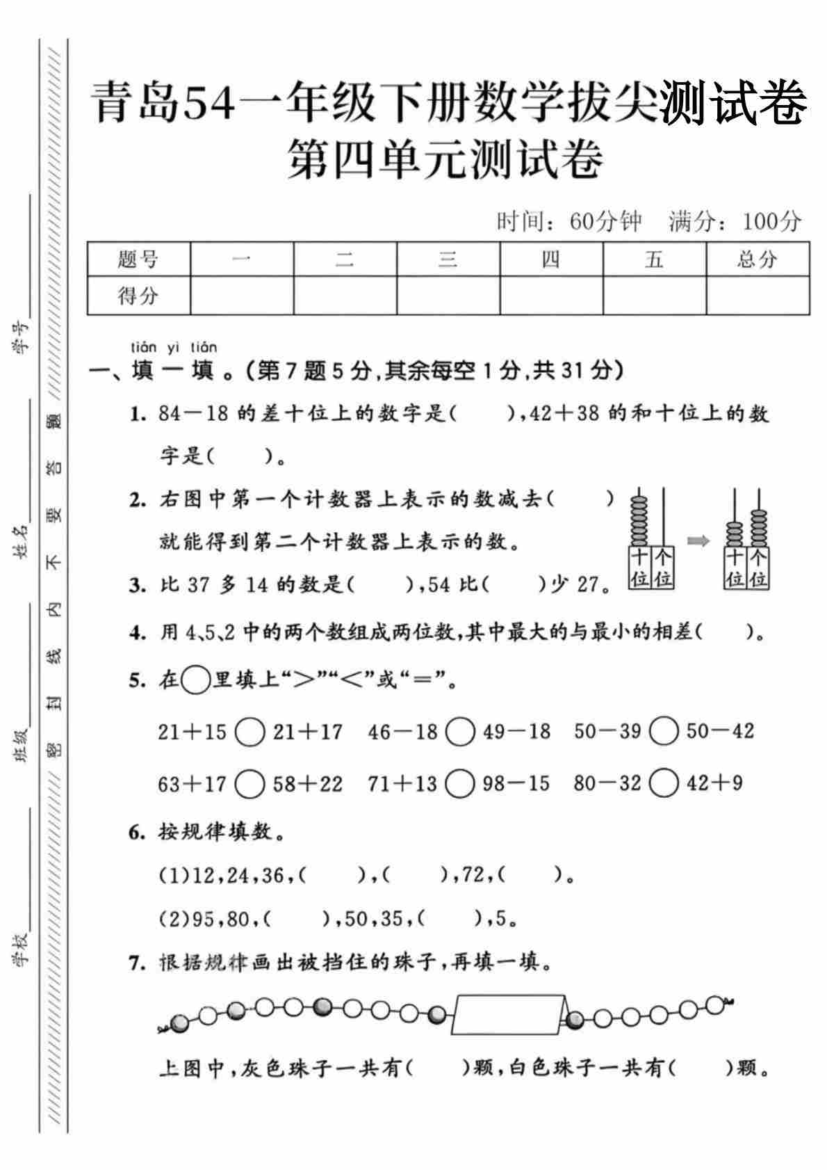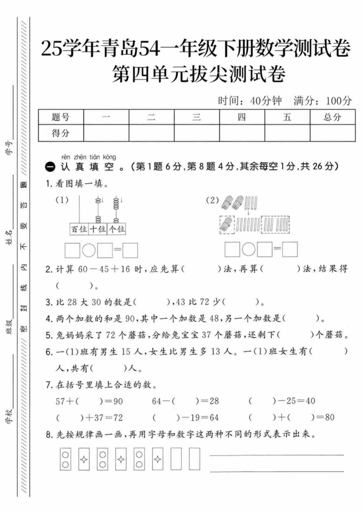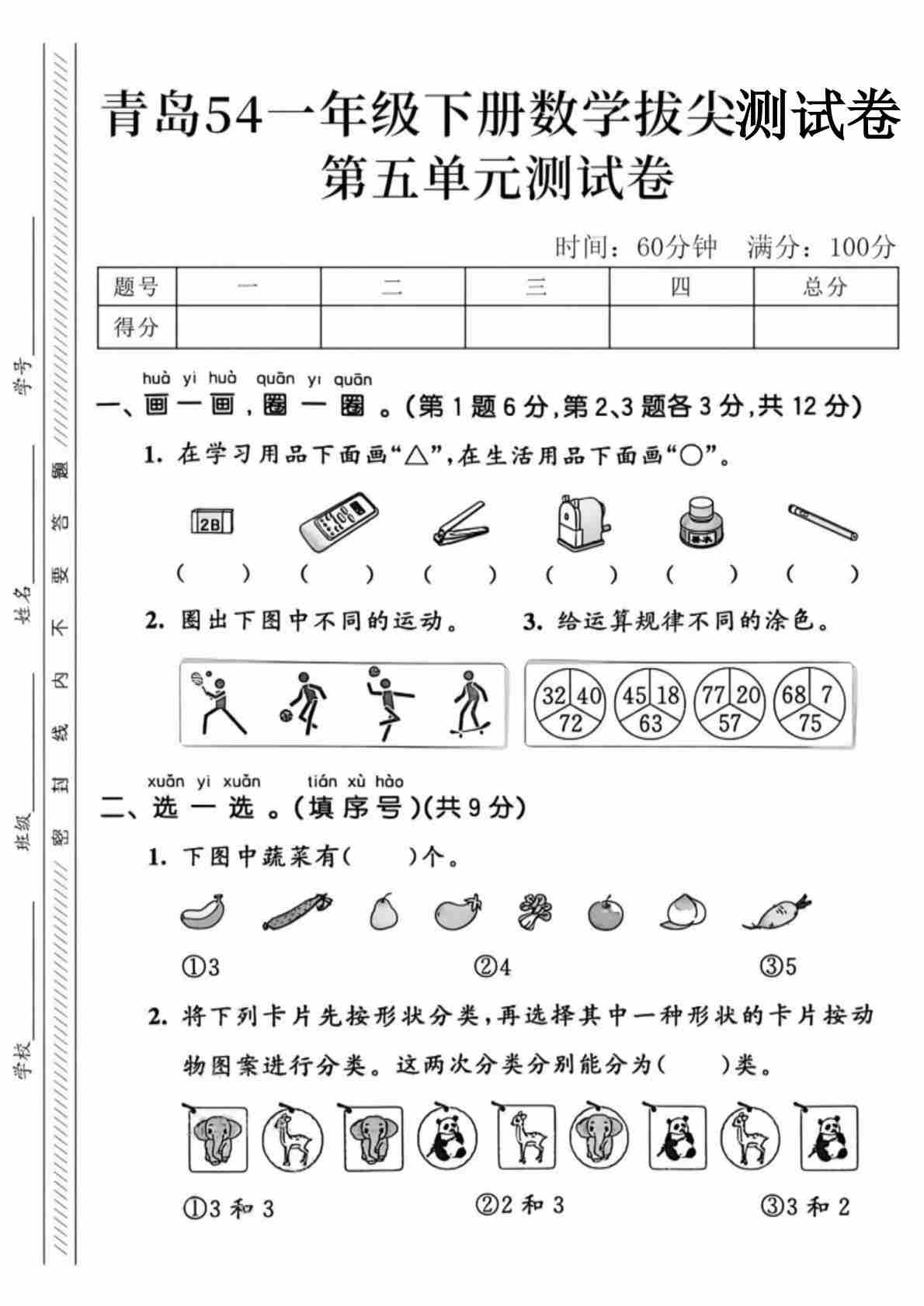 一年级(下)数学 第五单元拔尖测试卷1《青岛54》