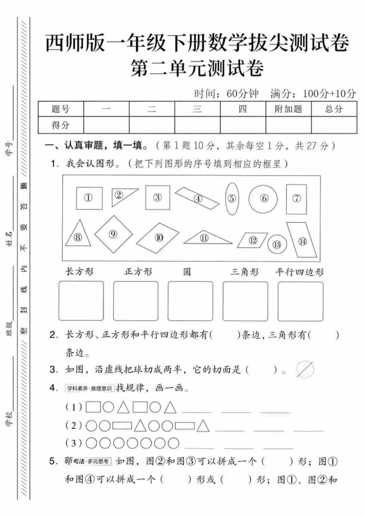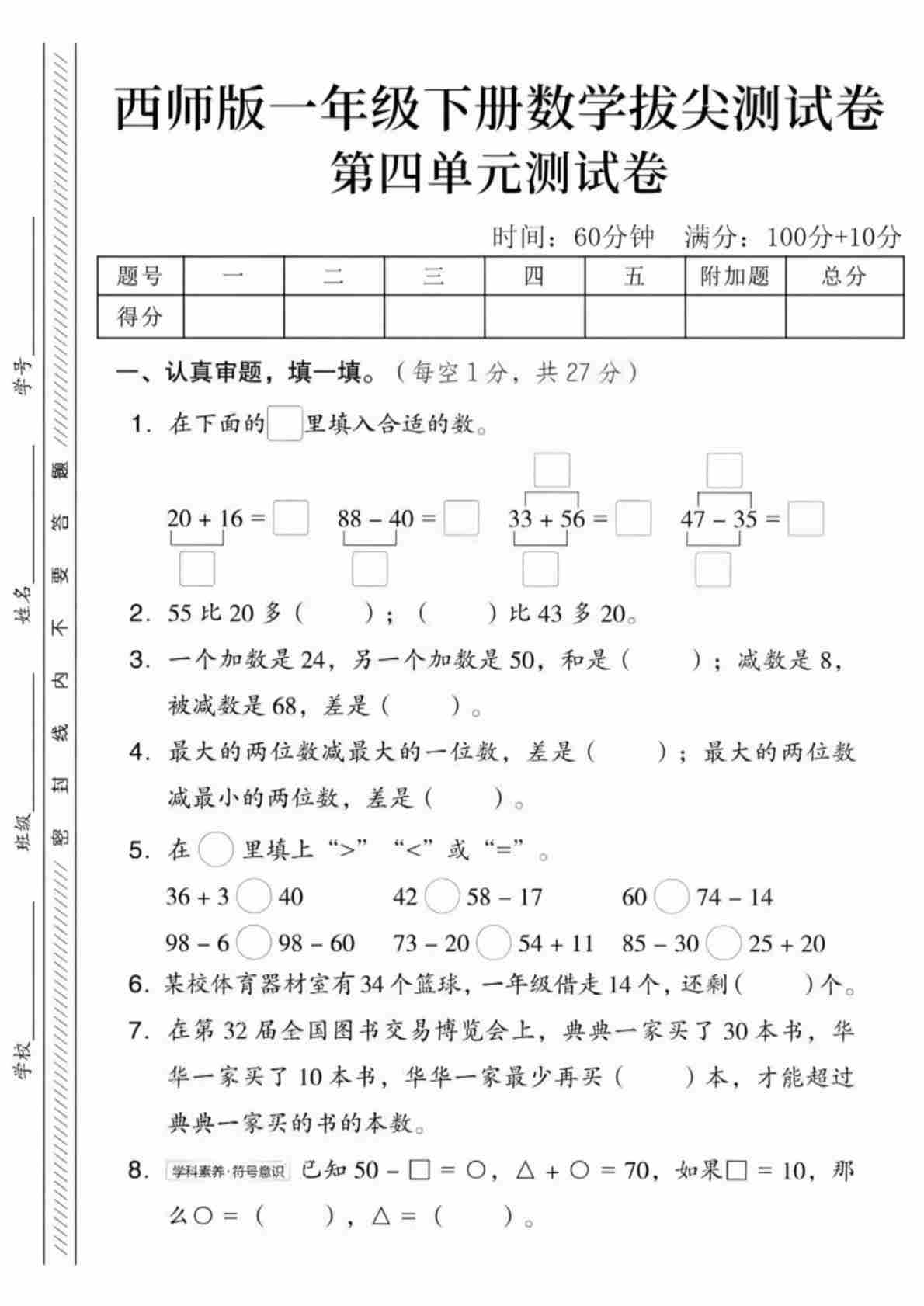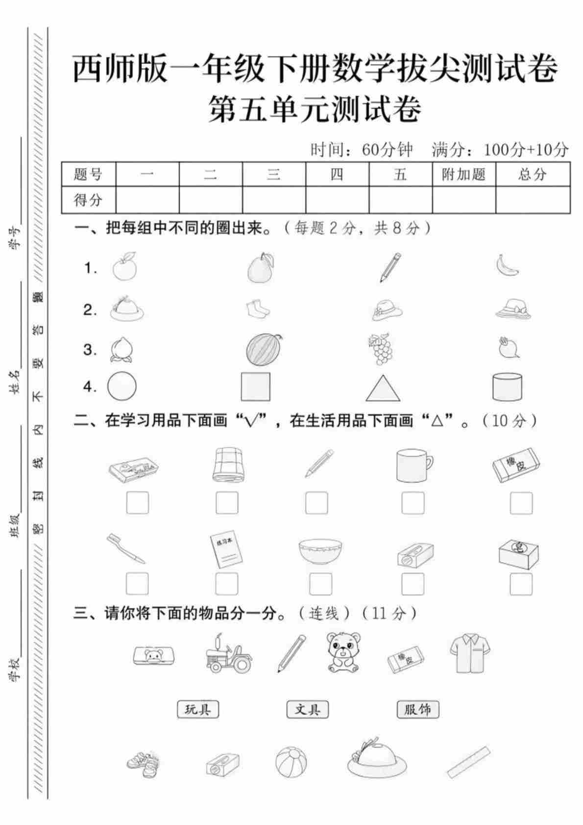一年级(下)数学 第五单元拔尖测试卷《西师版》