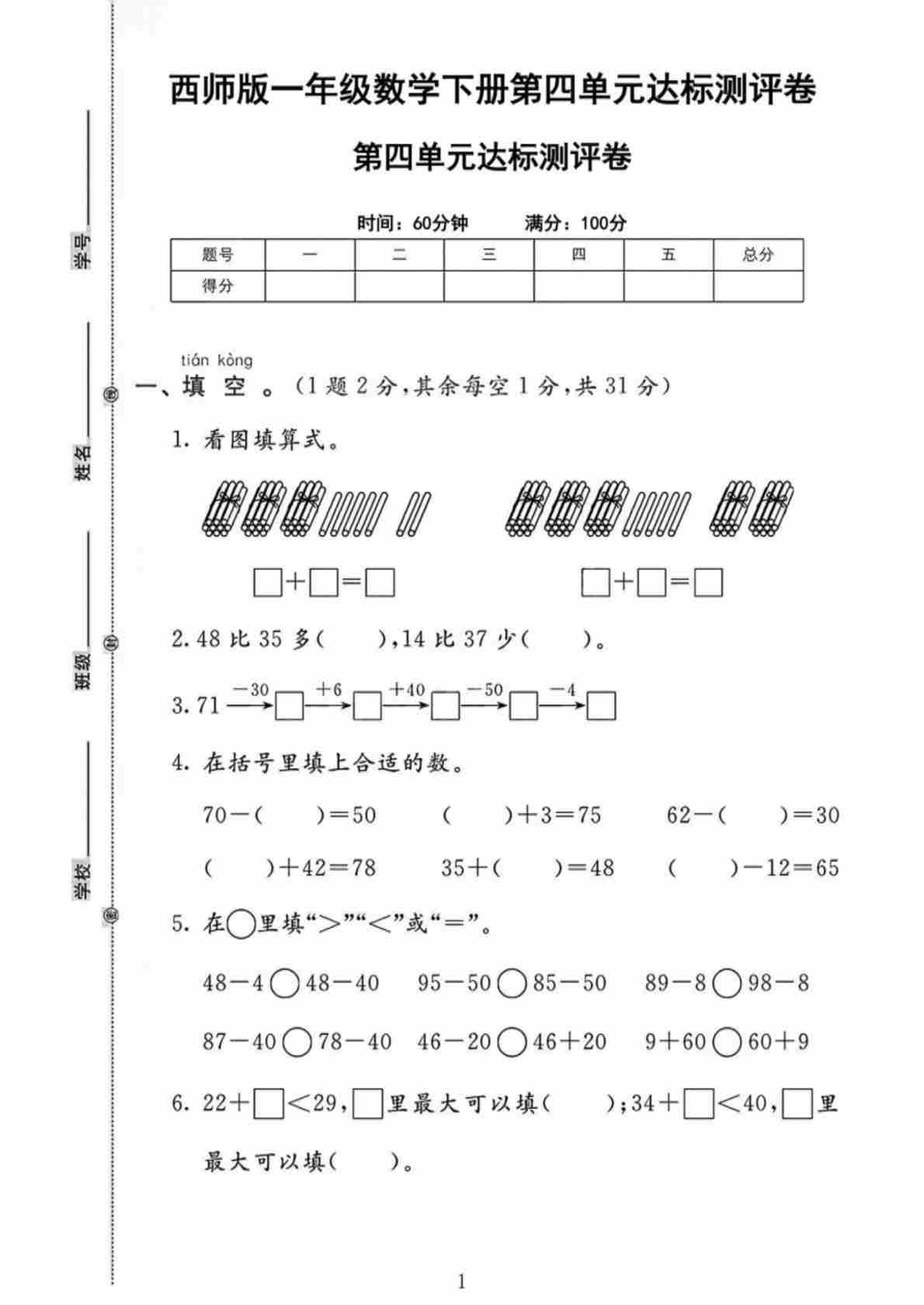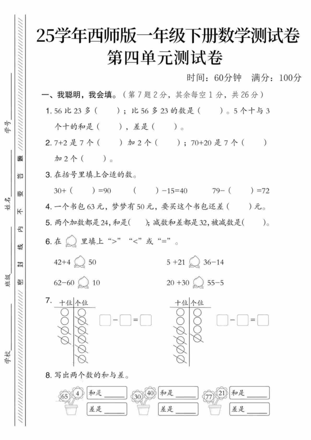 一年级(下)数学 第四单元测试卷《西师版》