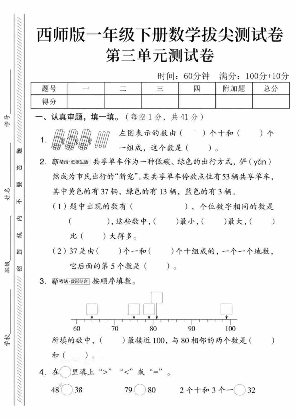 一年级(下)数学 第三单元拔尖测试卷《西师版》