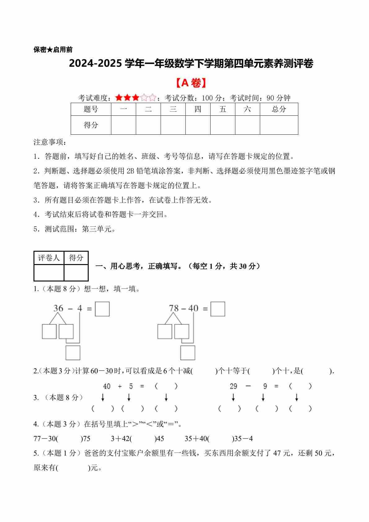 一年级(下)数学 第四单元达标测评卷《西师版》