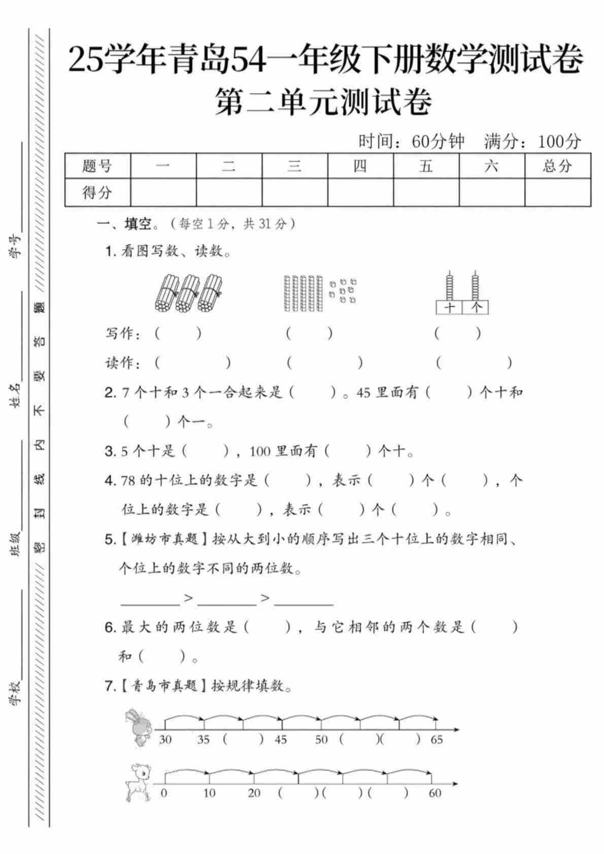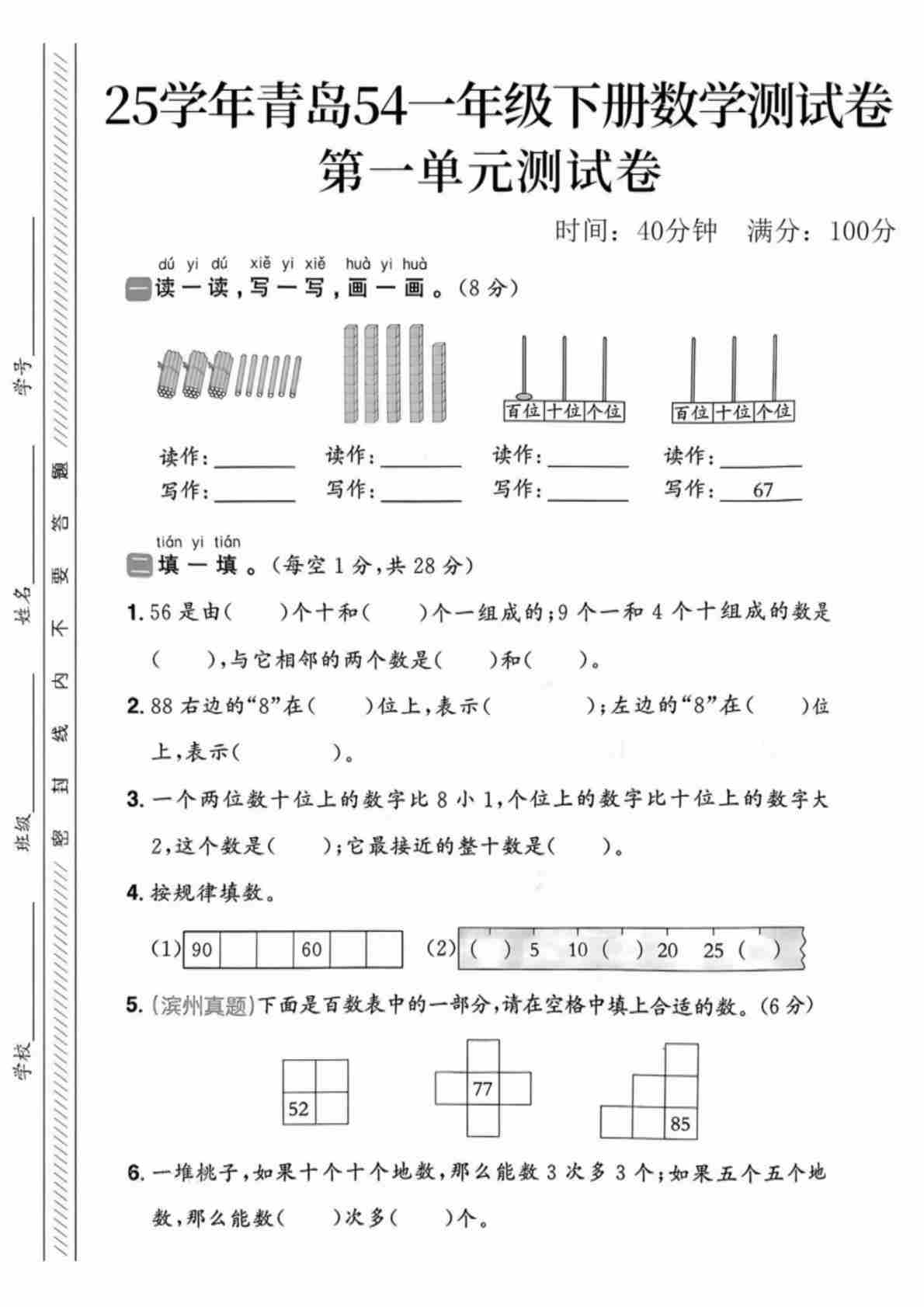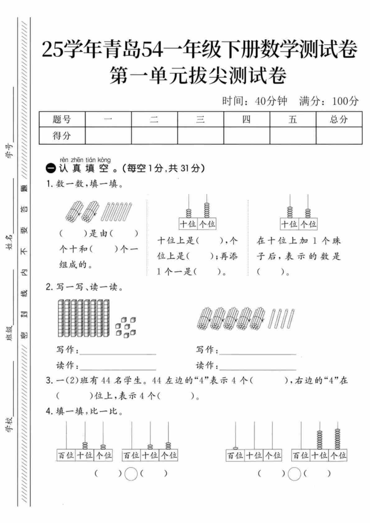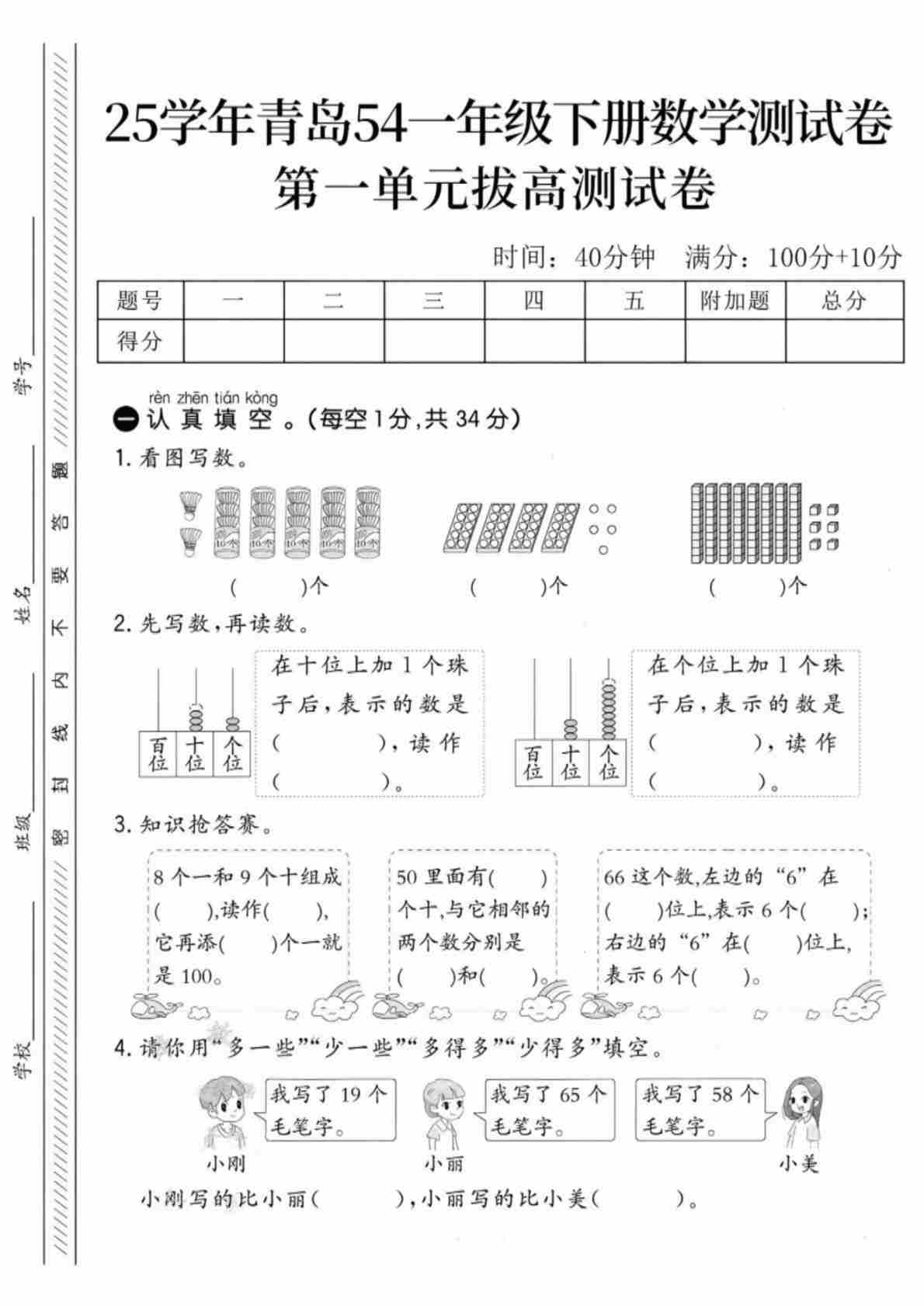 25年一年级(下)数学第一单元拔高测试卷《青岛54》