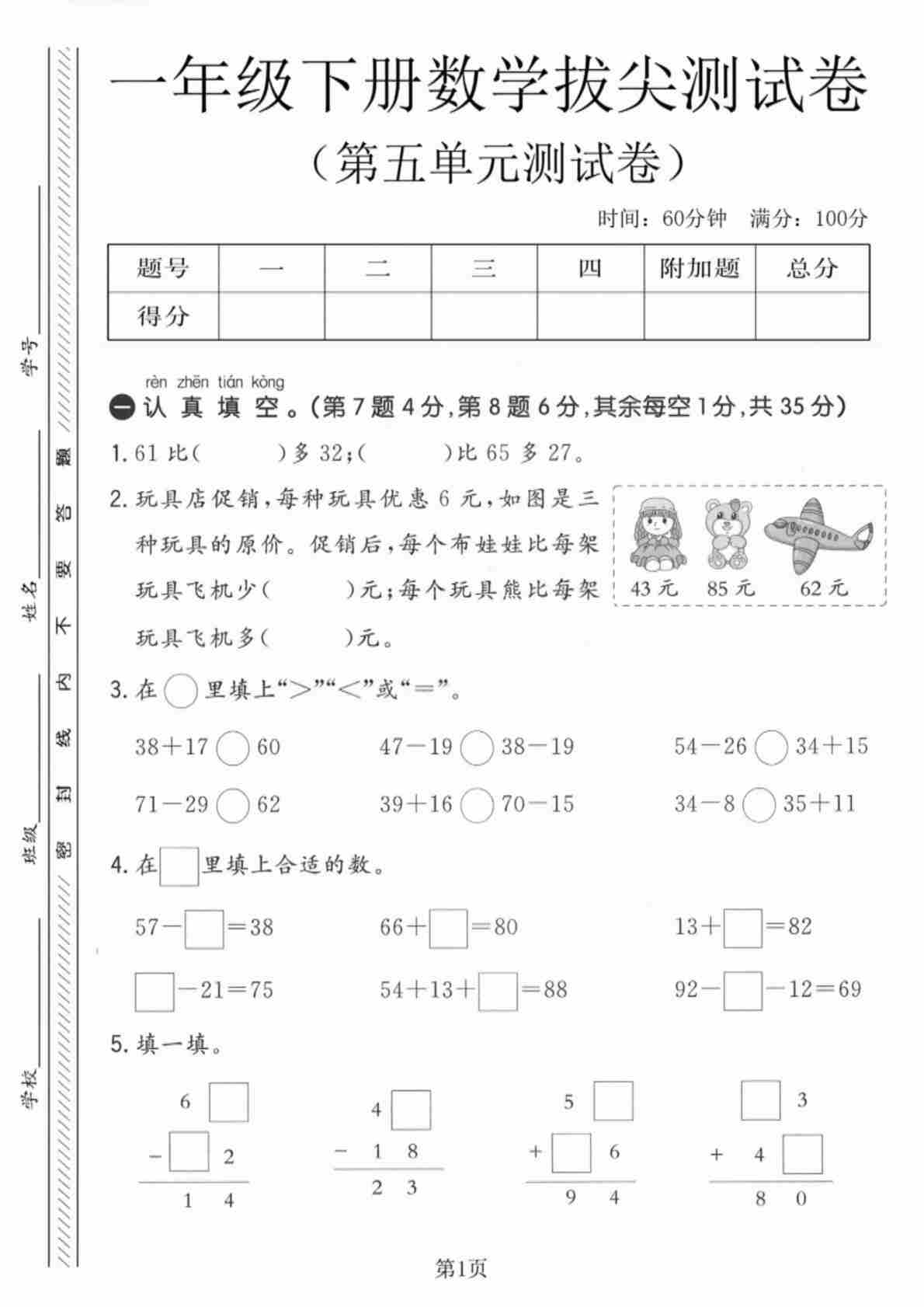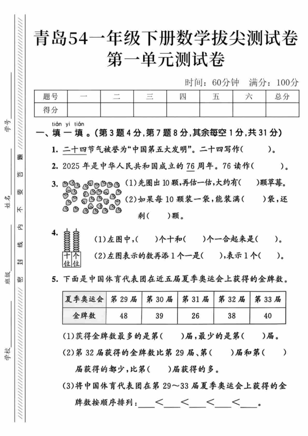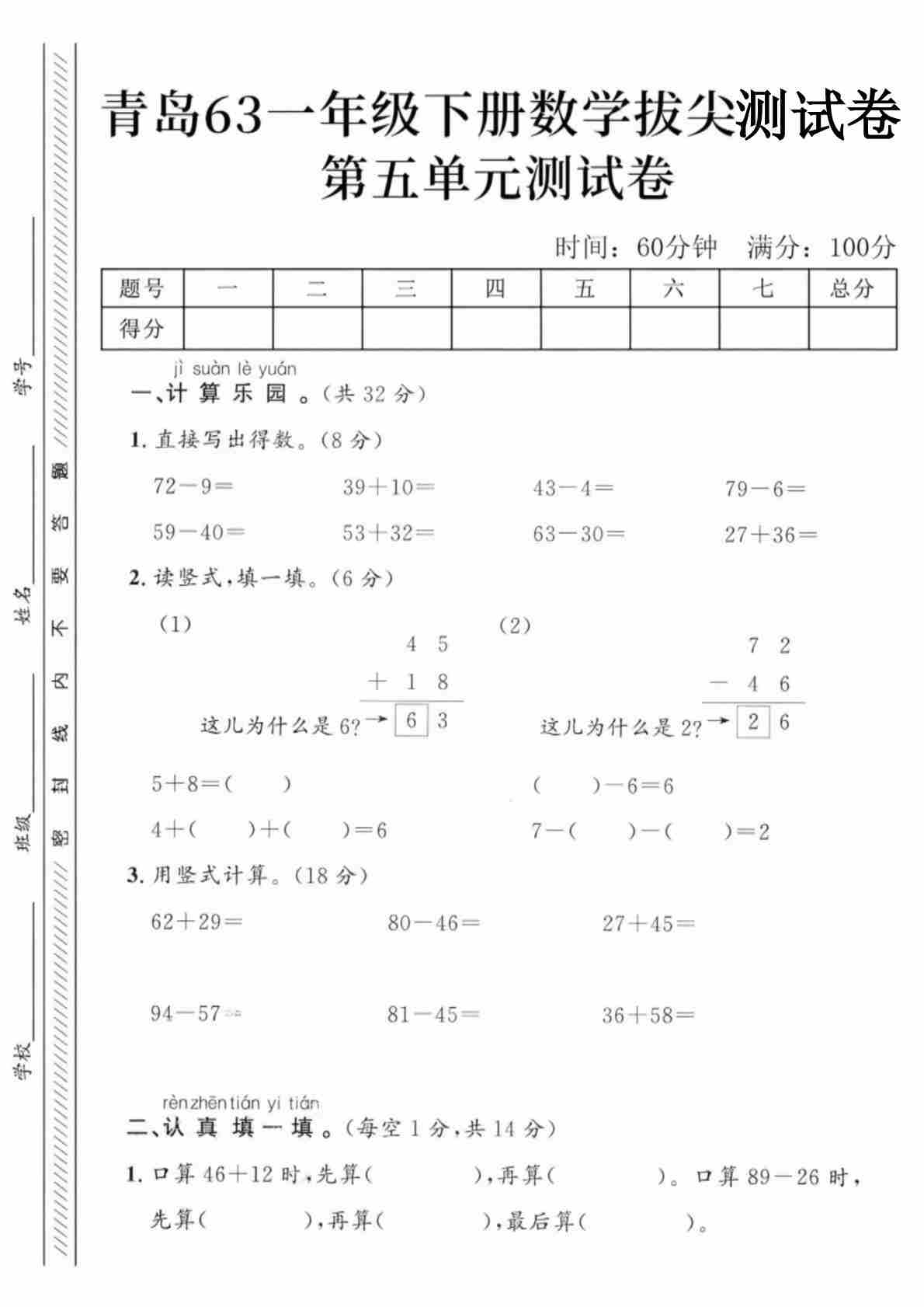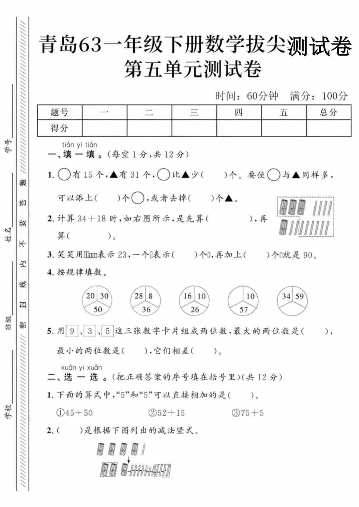 一年级(下)数学 第五单元拔尖测试卷《青岛63》