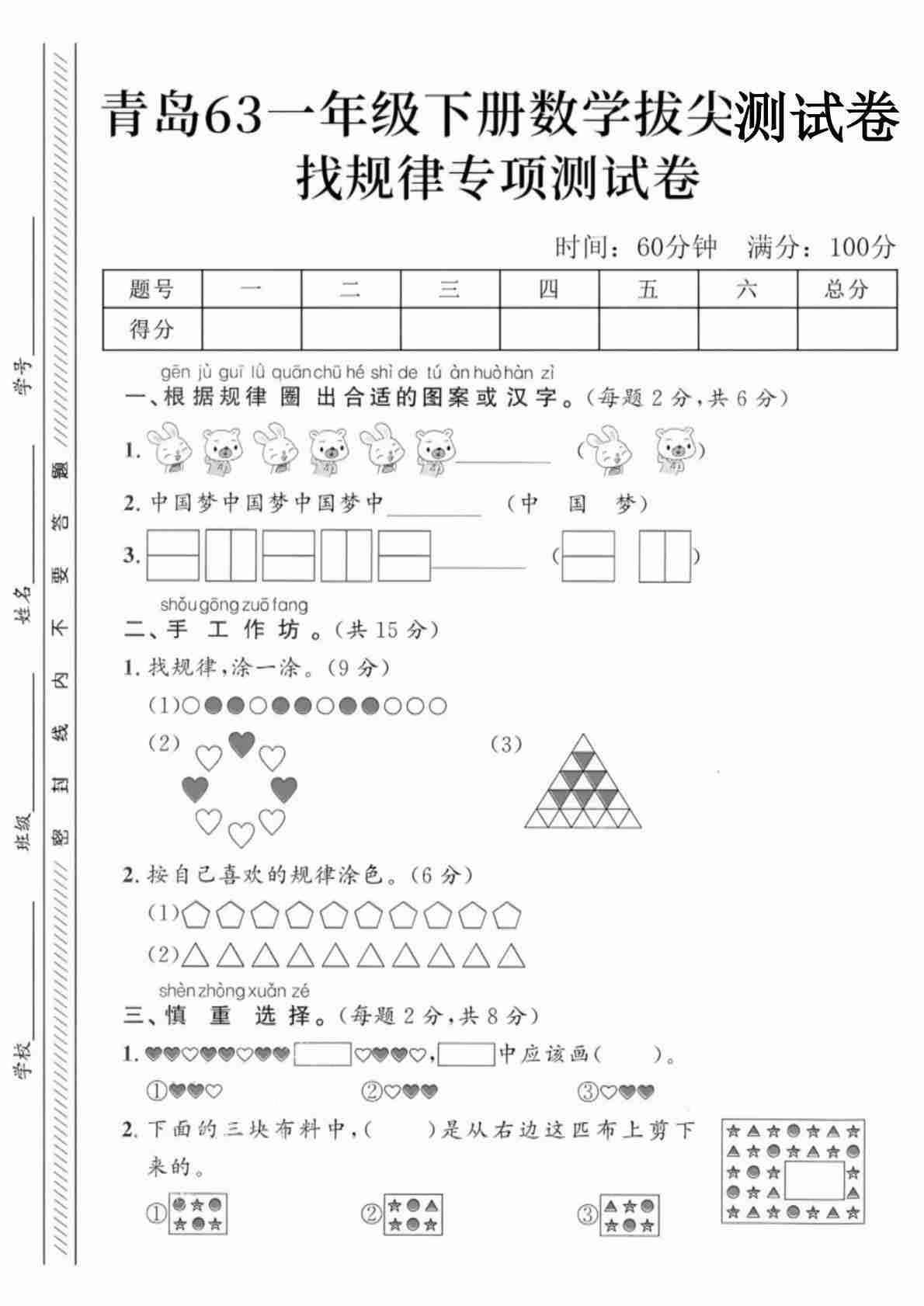 一年级(下)数学 找规律拔尖专项卷《青岛63》