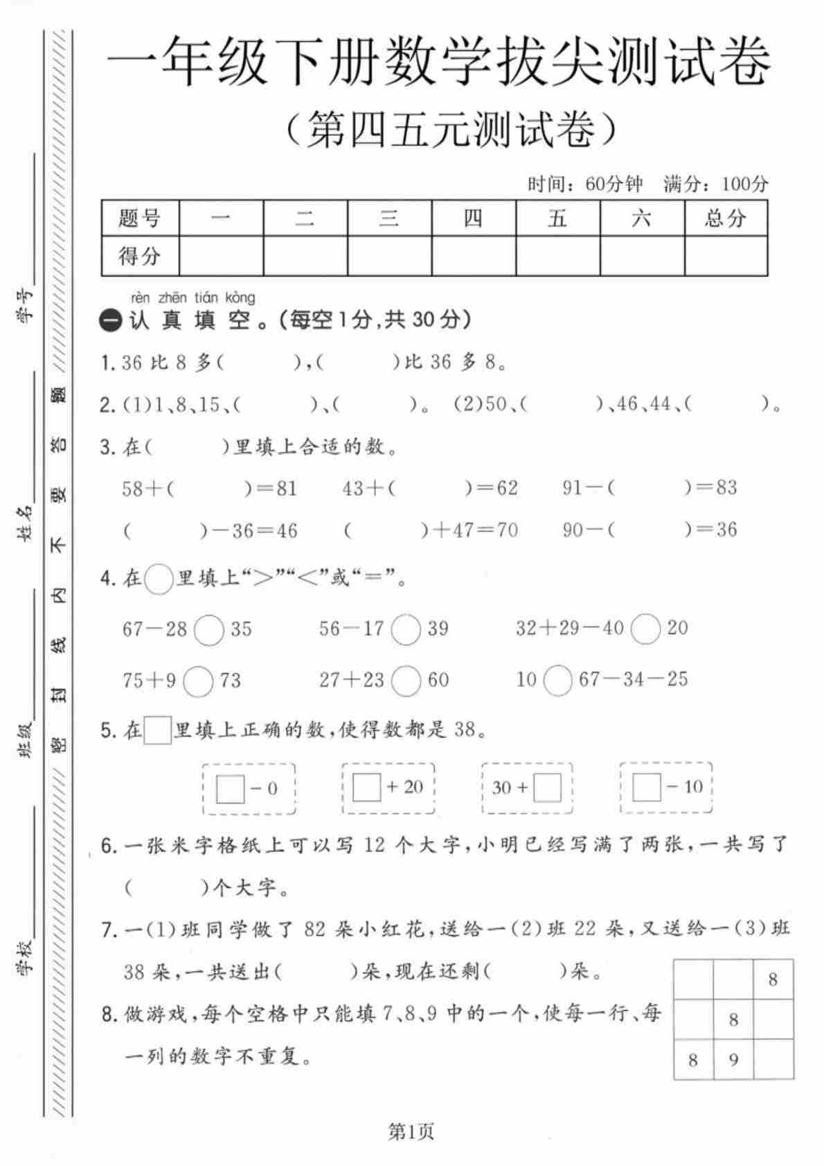 一年级(下)数学 第四、五单元拔尖测试卷《青岛63》