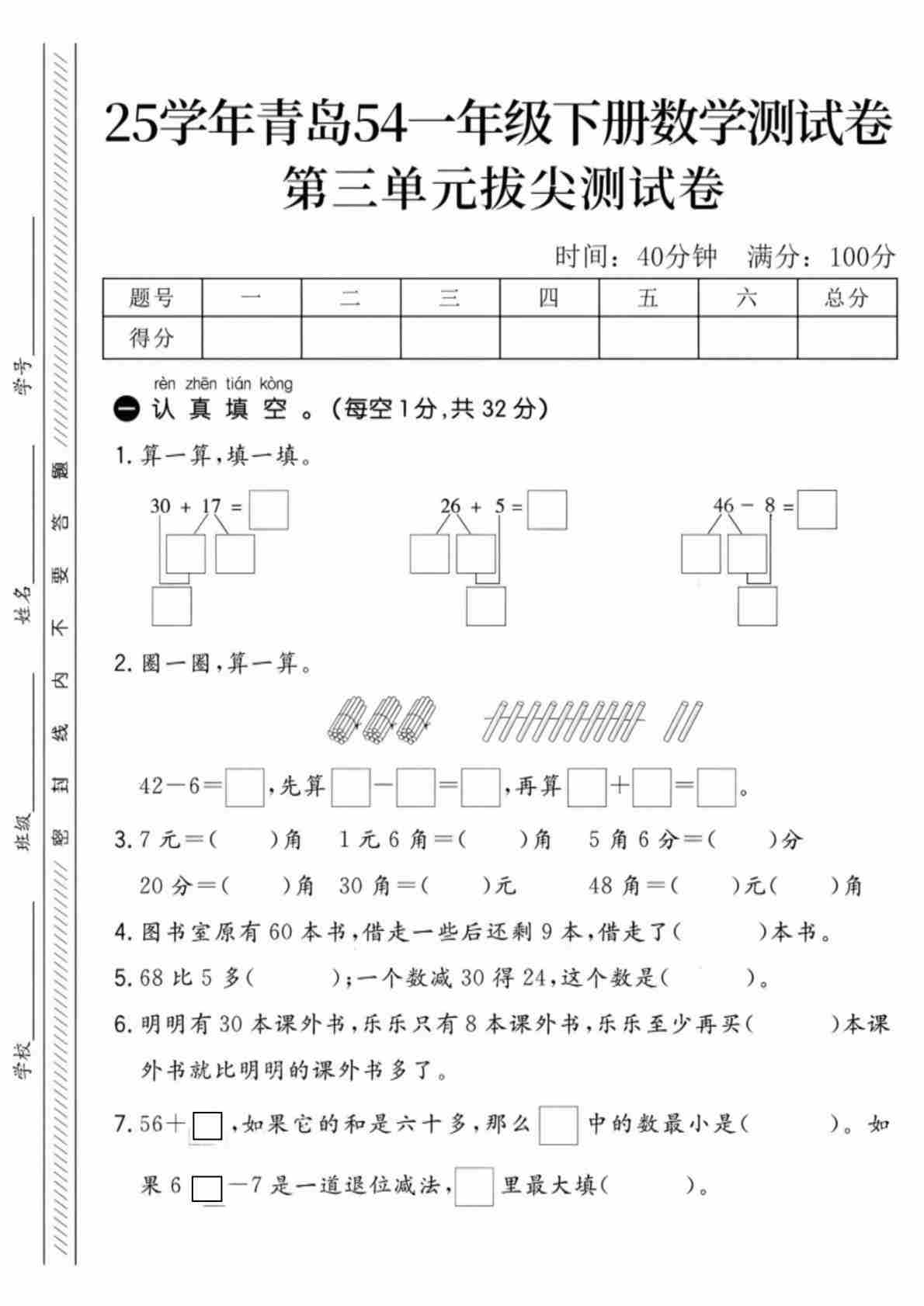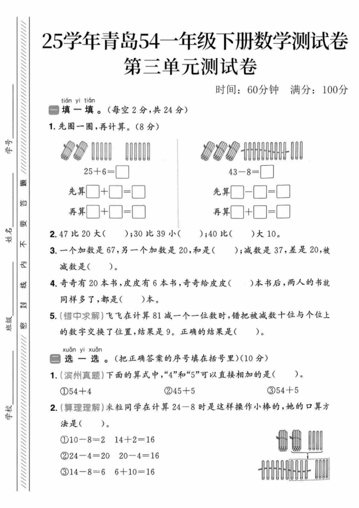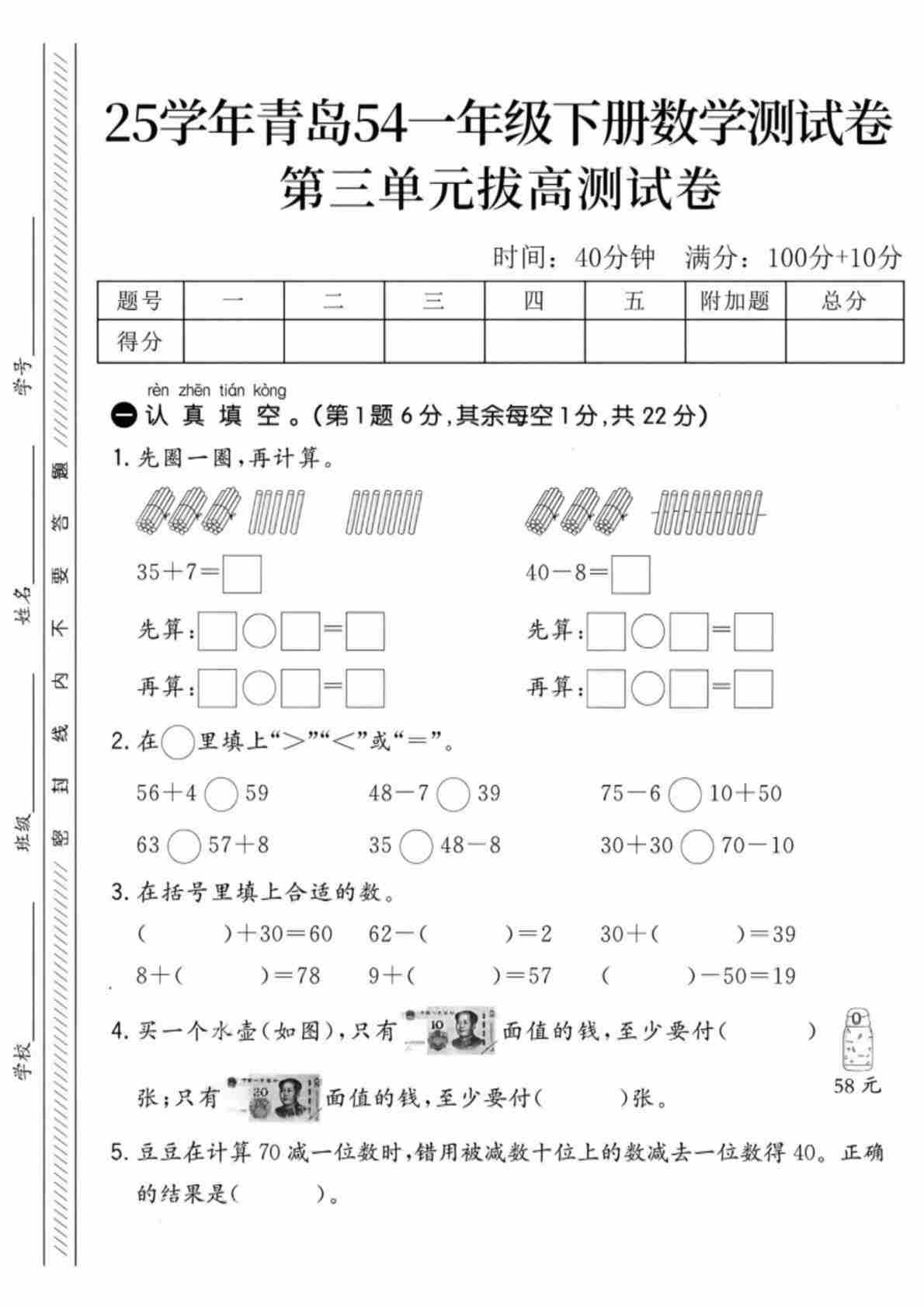 25年一年级(下)数学第三单元拔高测试卷《青岛54》
