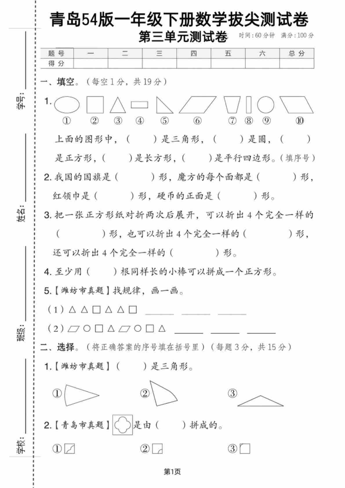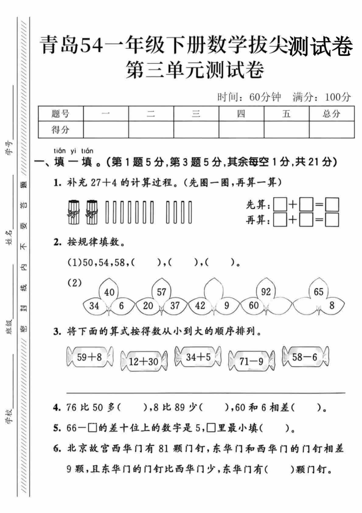 一年级(下)数学 第三单元拔尖测试卷《青岛54版》