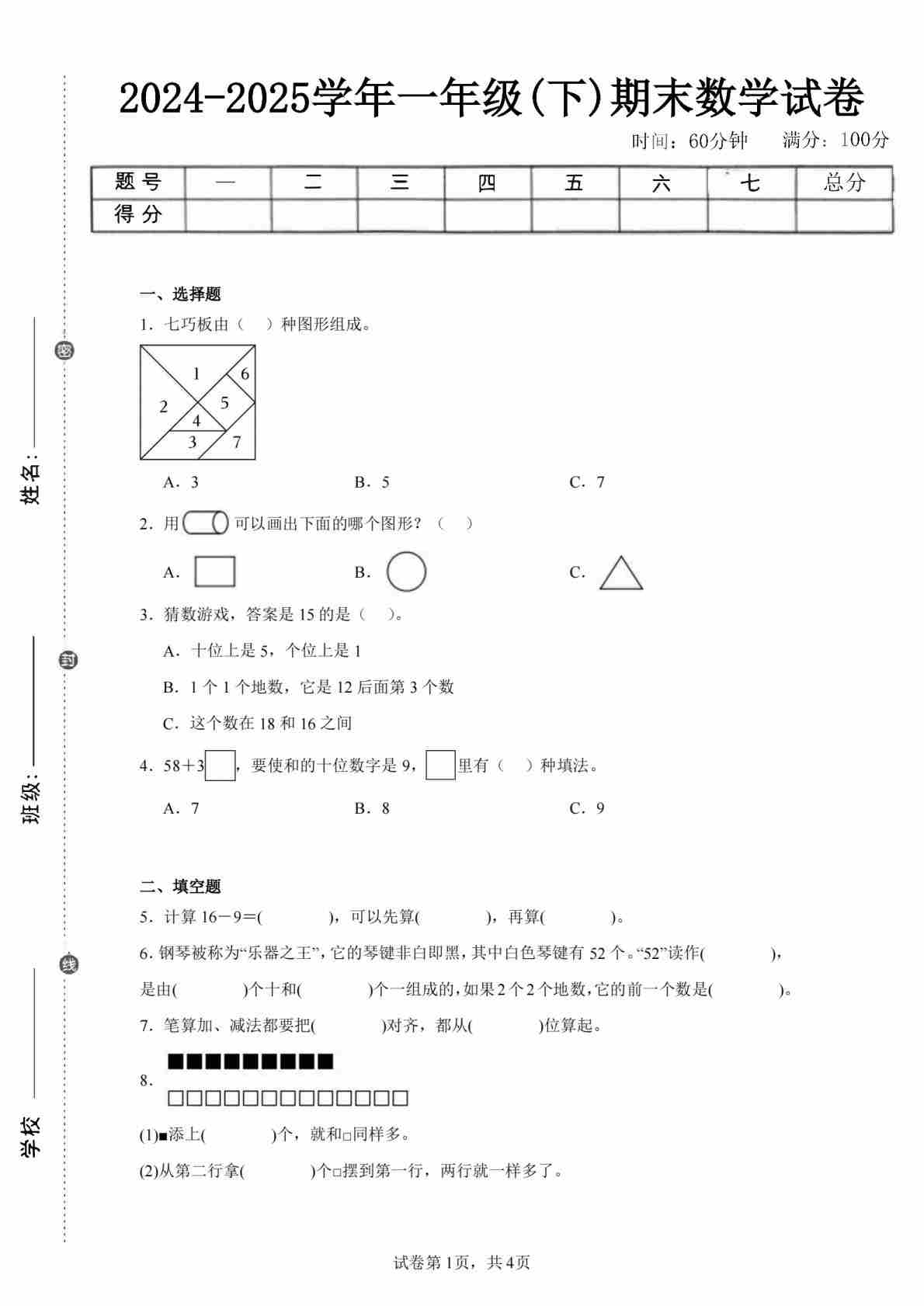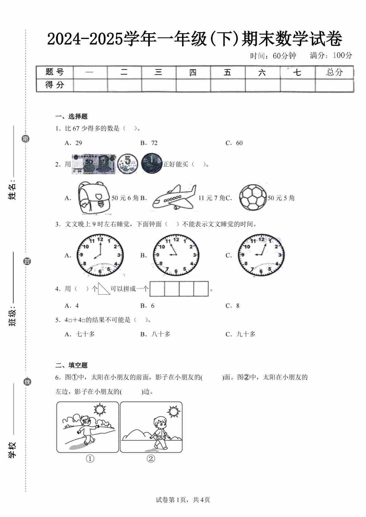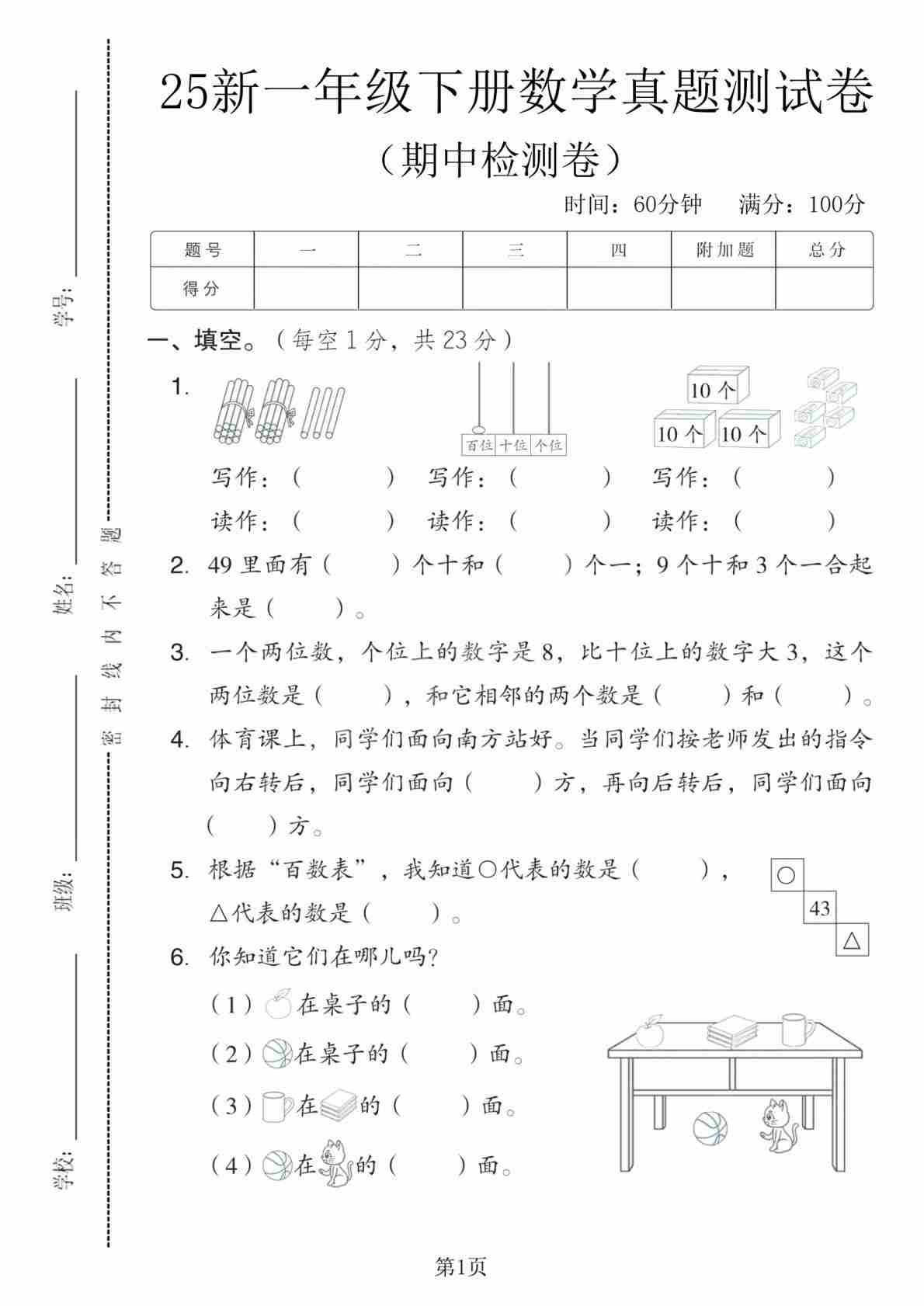 一(下)数学【25春】翼教版期中真题测试卷1(4页)