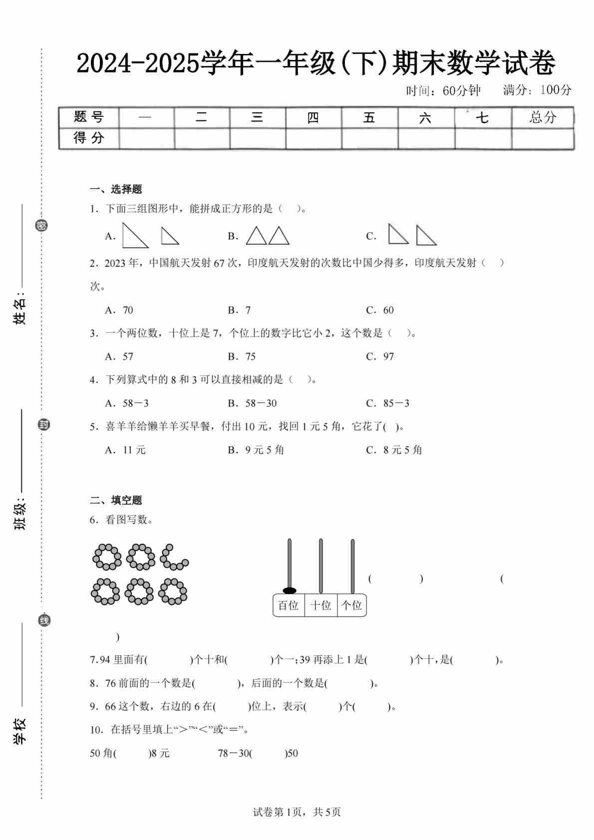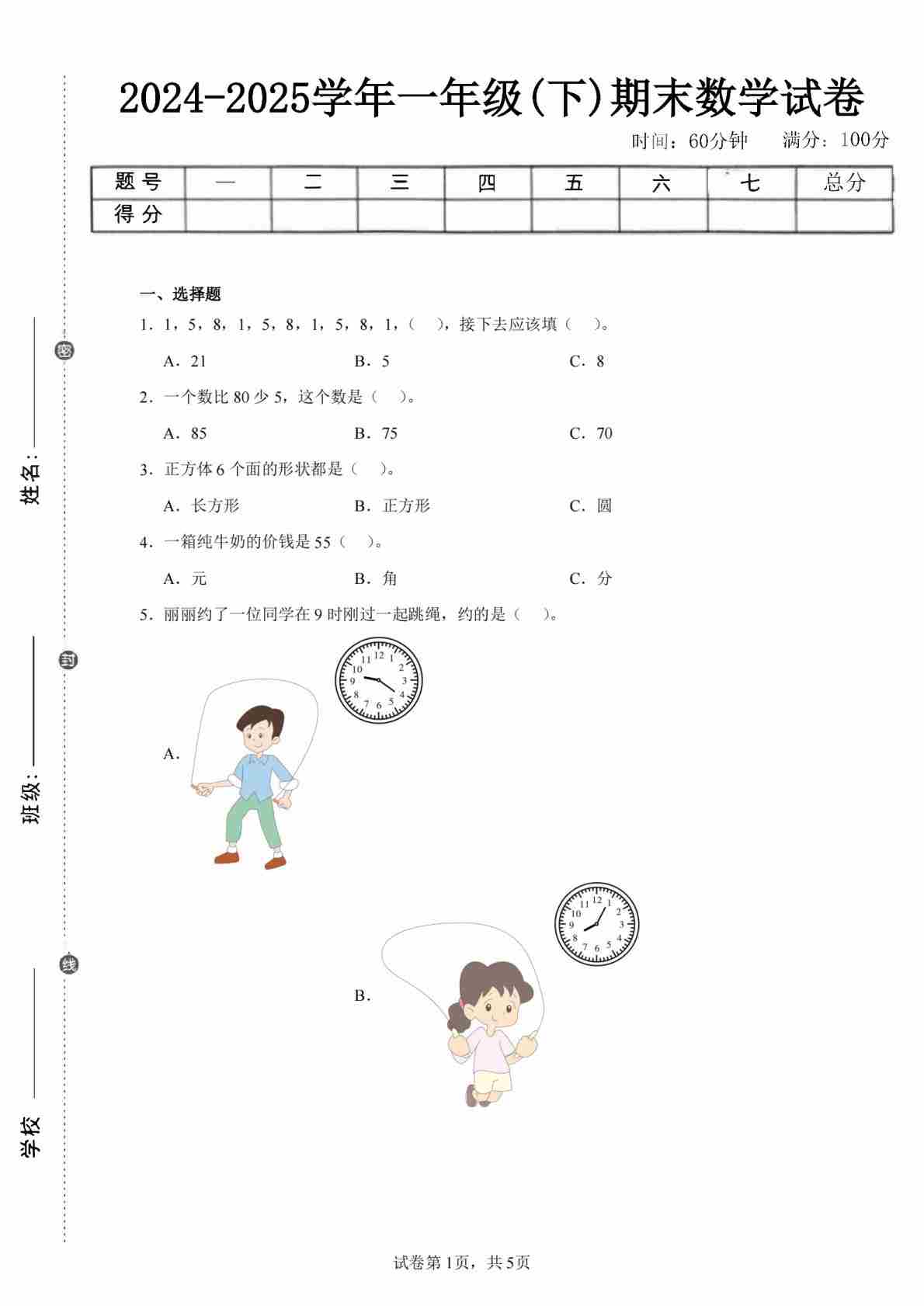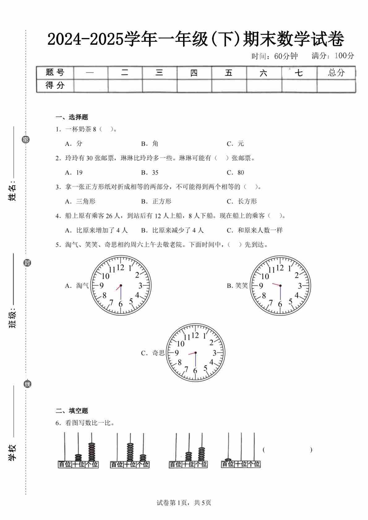 一(下)数学24-25学年翼教版期末试卷五(含答案解析10页)