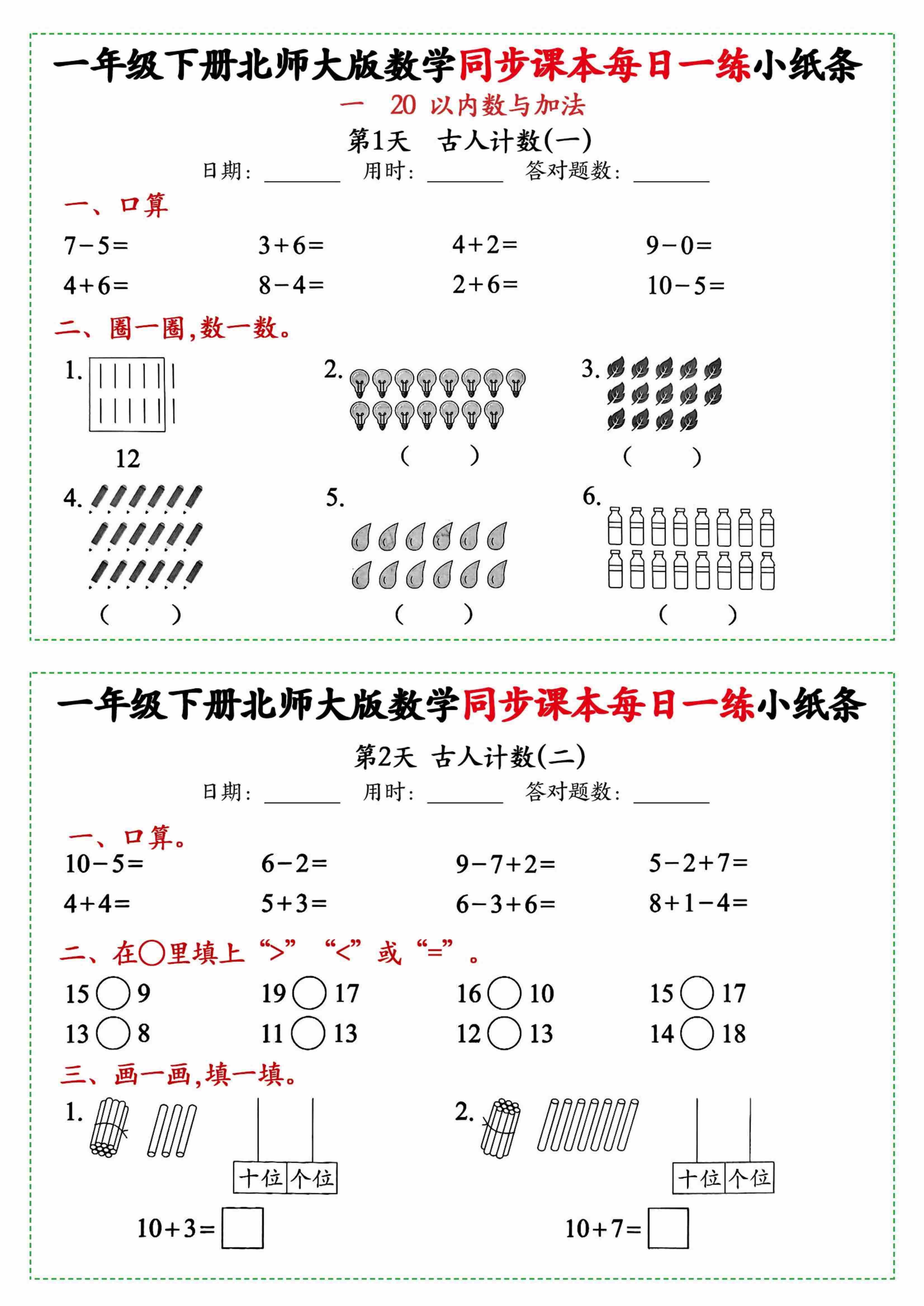 一(下)数学新北师大版每日一练小纸条71天40页附答案