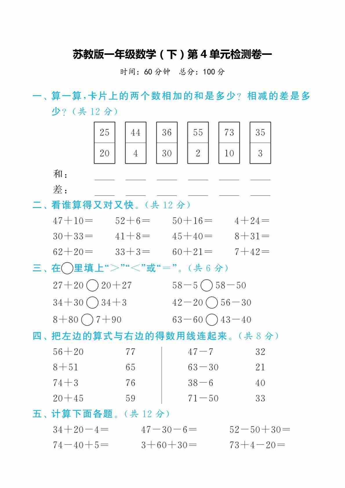 一(下)数学苏教版久为全彩版大字口算题