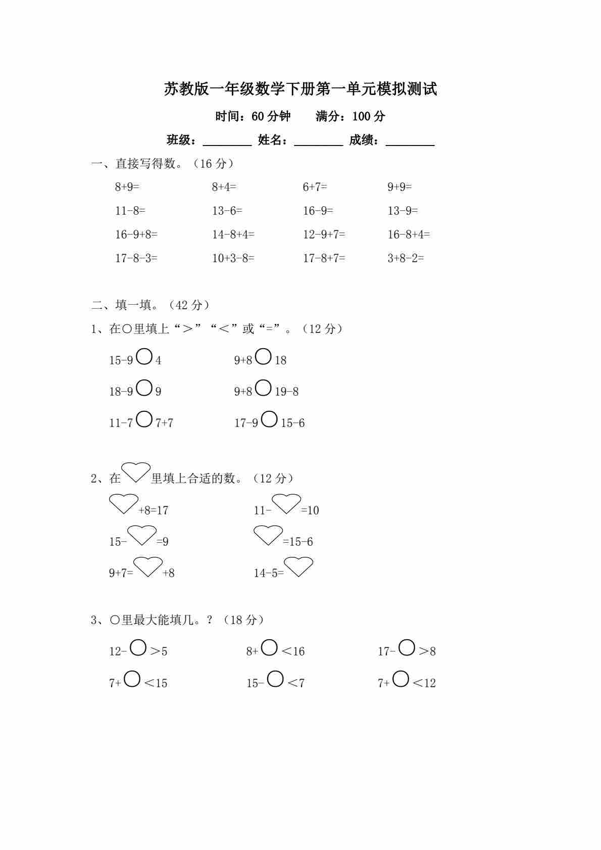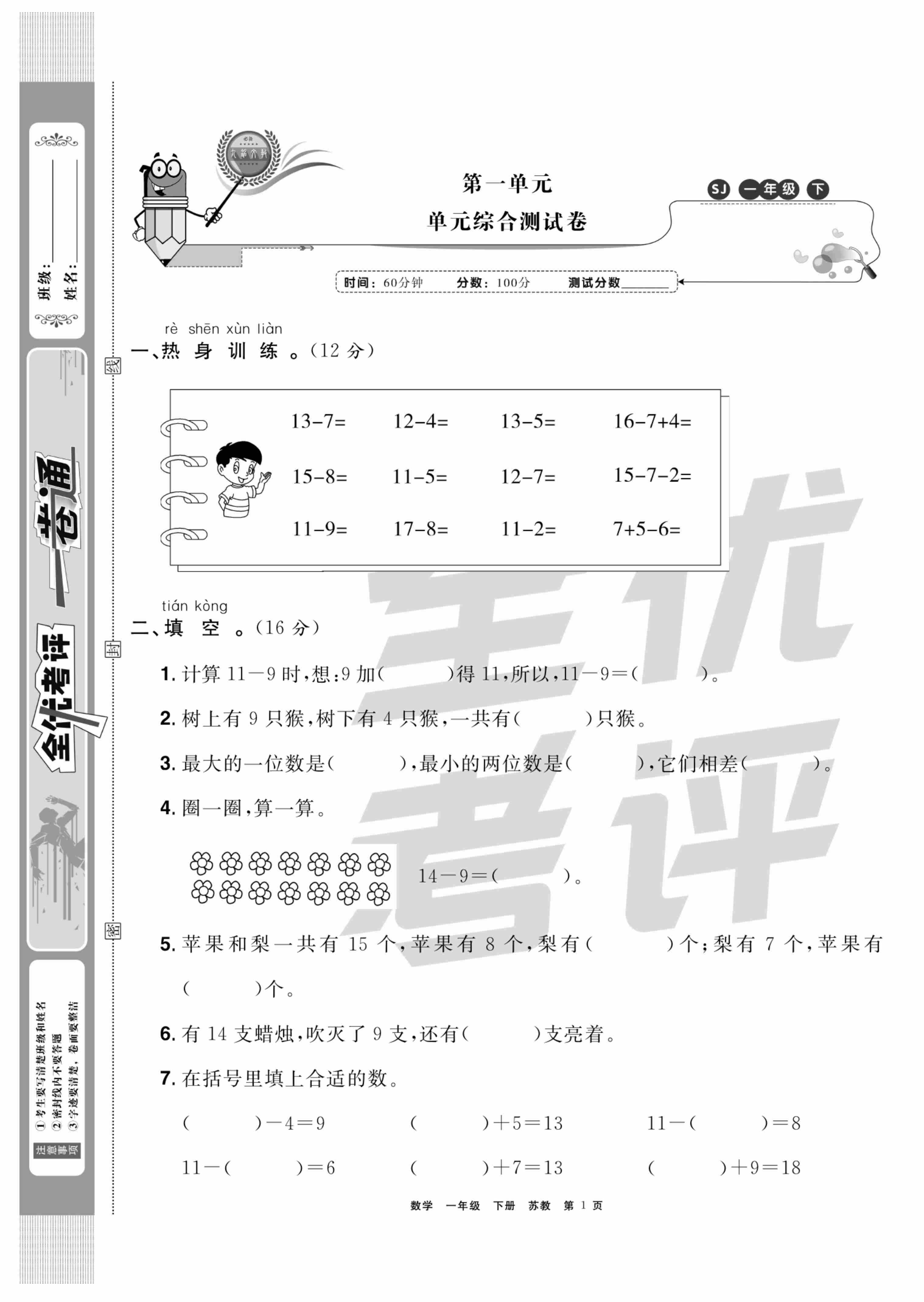 一(下)数学【25春】苏教版第一单元《进位加法和退位减法》测试卷