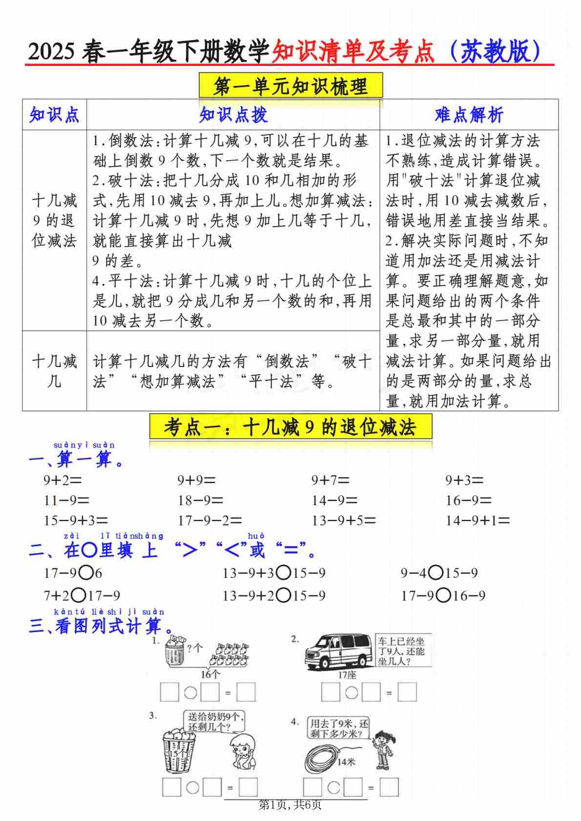 一(下)苏教版数学【2025春-知识清单及考点】
