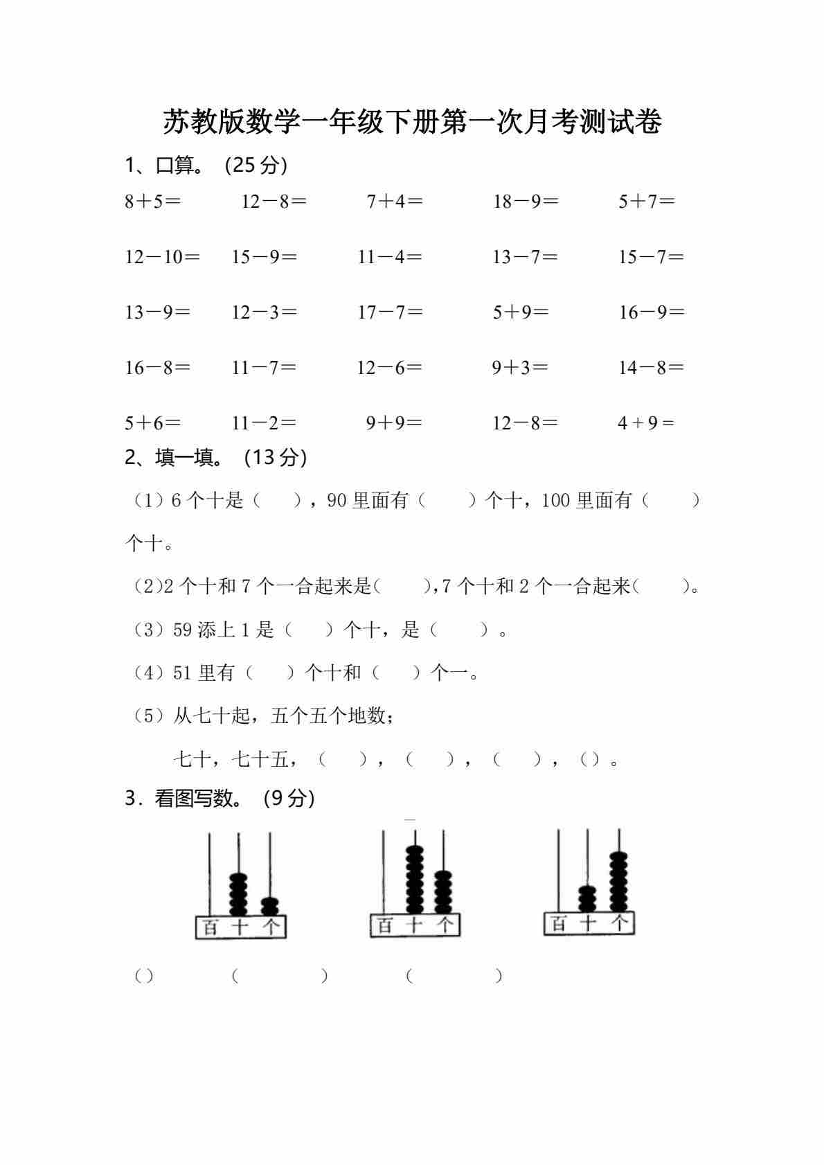 一(下)苏教版数学第一次月考试卷
