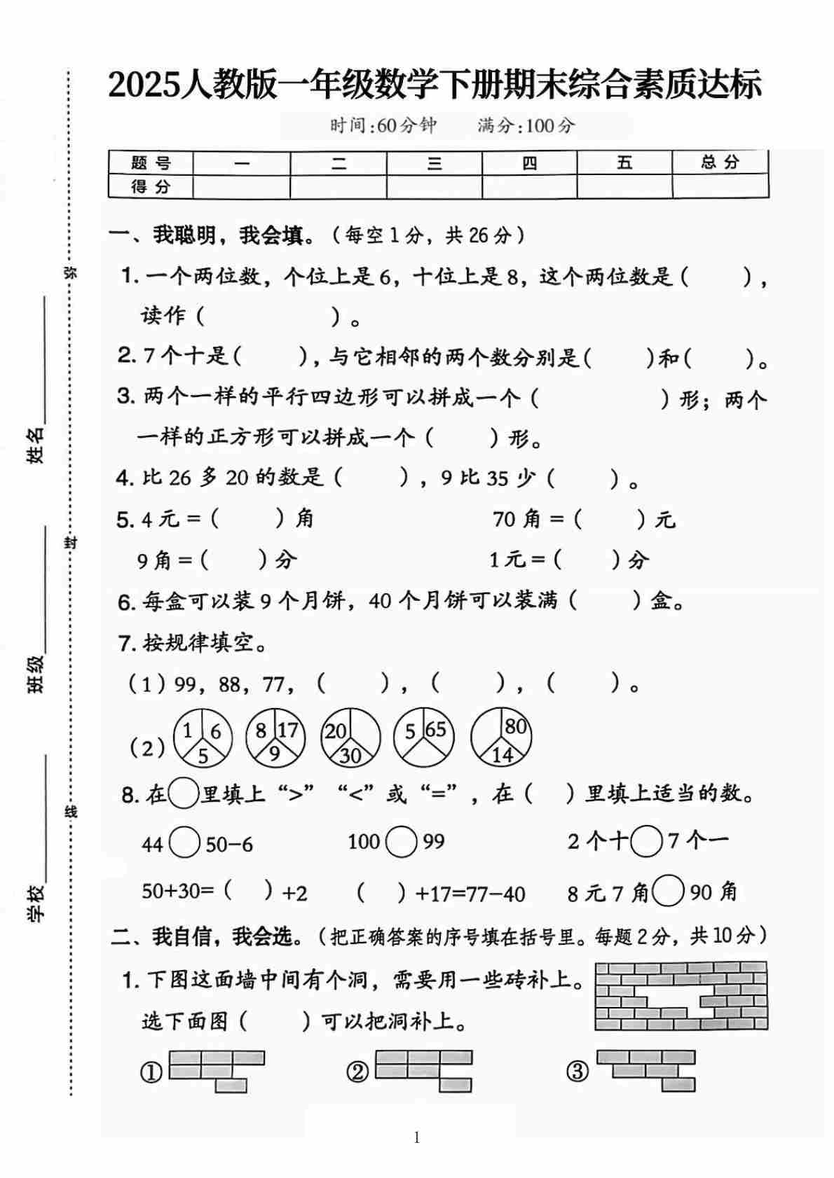 一(下)数学人教版【25春-期末综合素质达标测试卷(含答案5页)】