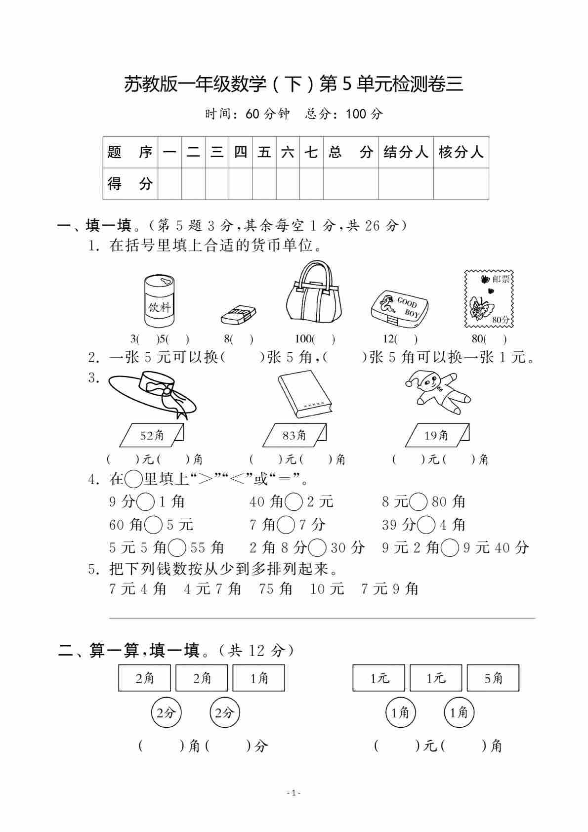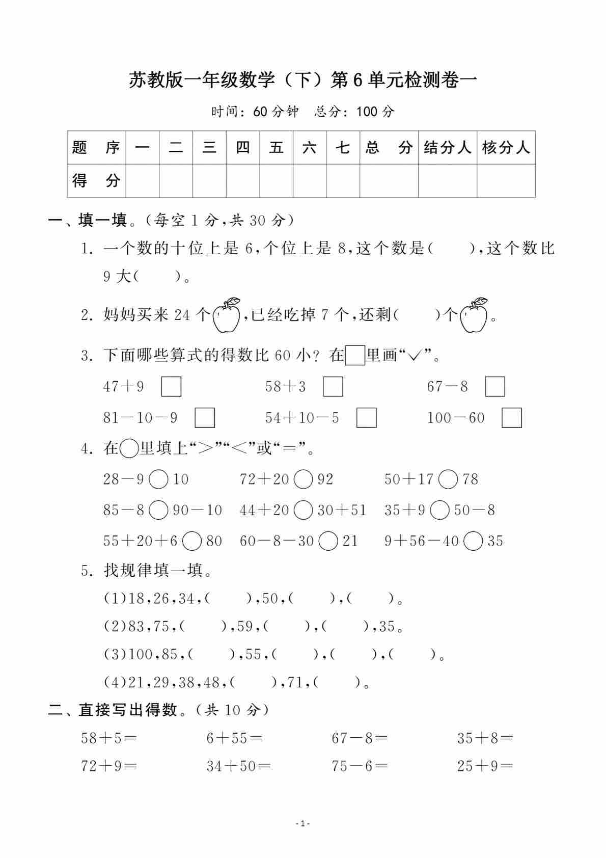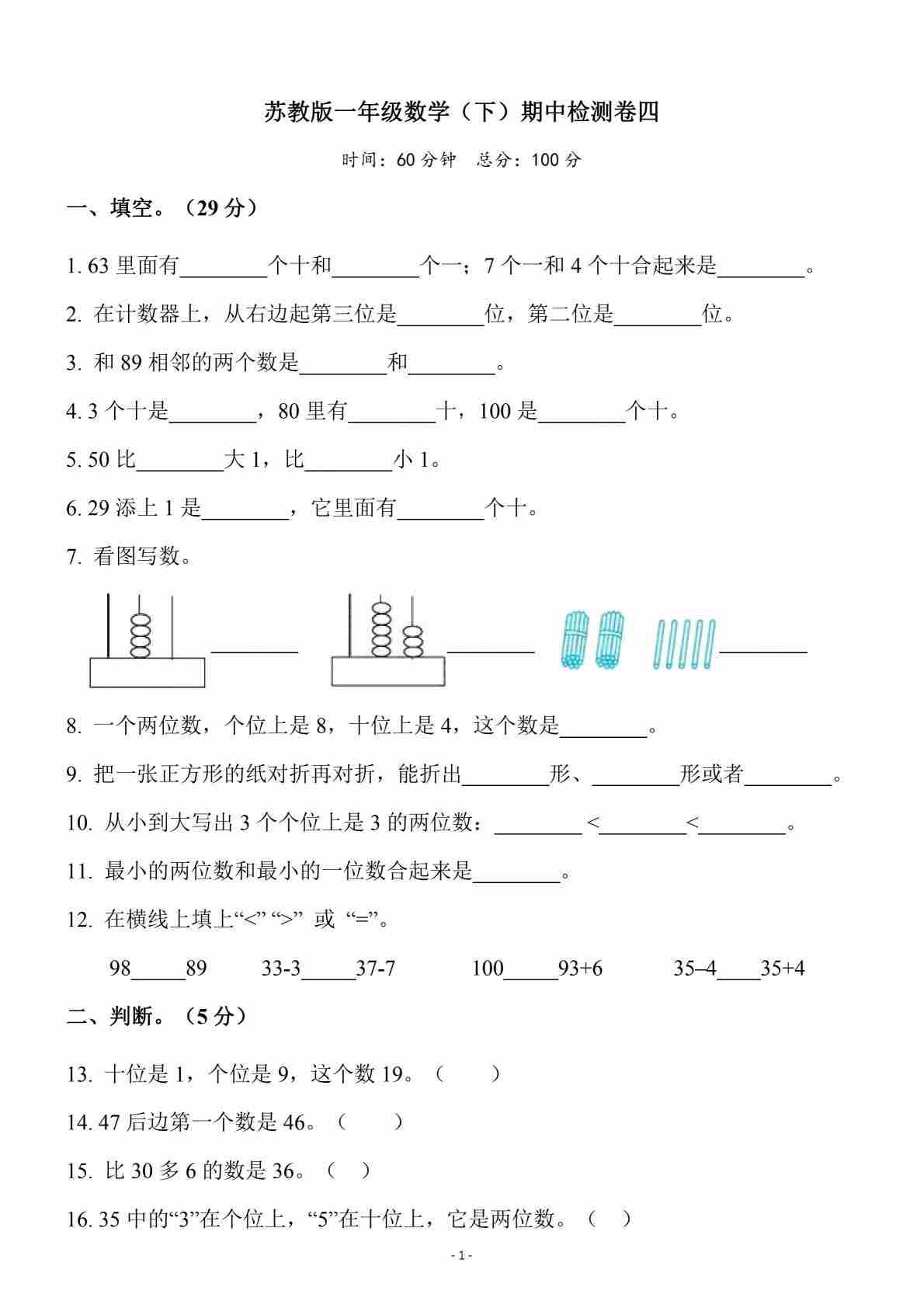 一(下)数学25年苏教版期末测试卷 (1)