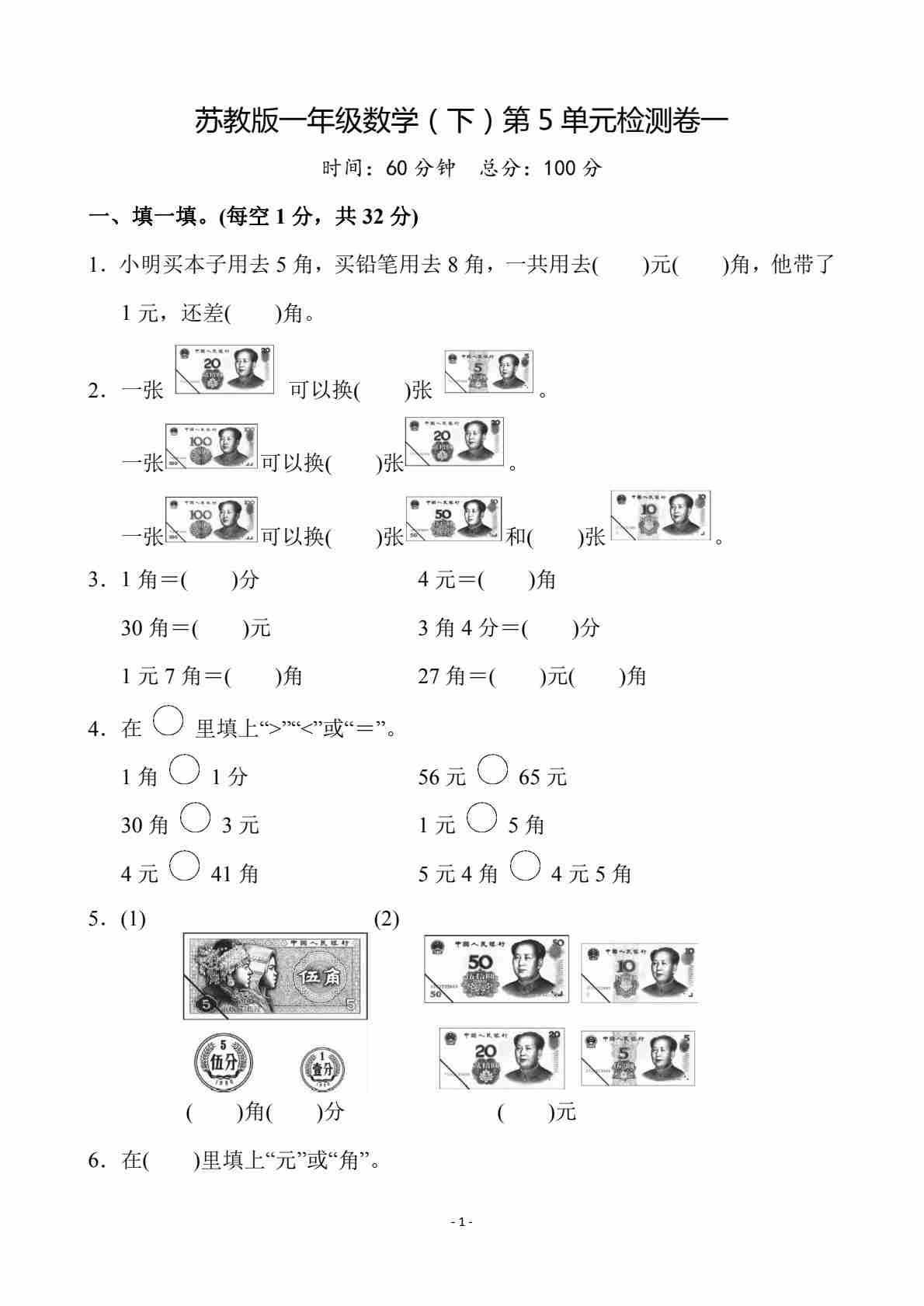 一(下)苏教版数学第五单元测试卷.1