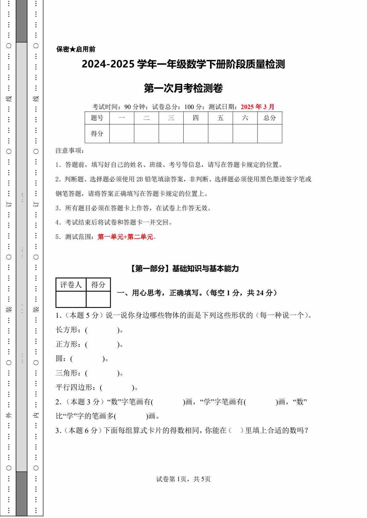 【A4考试版】第一次月考检测卷-2024-2025学年一年级数学下册阶段质量检测(人教版)
