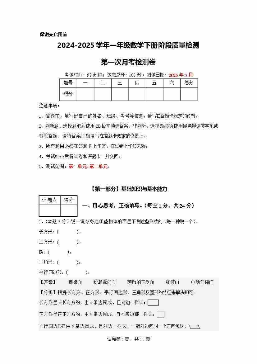 【参考解析】第一次月考检测卷-2024-2025学年一年级数学下册阶段质量检测(人教版)