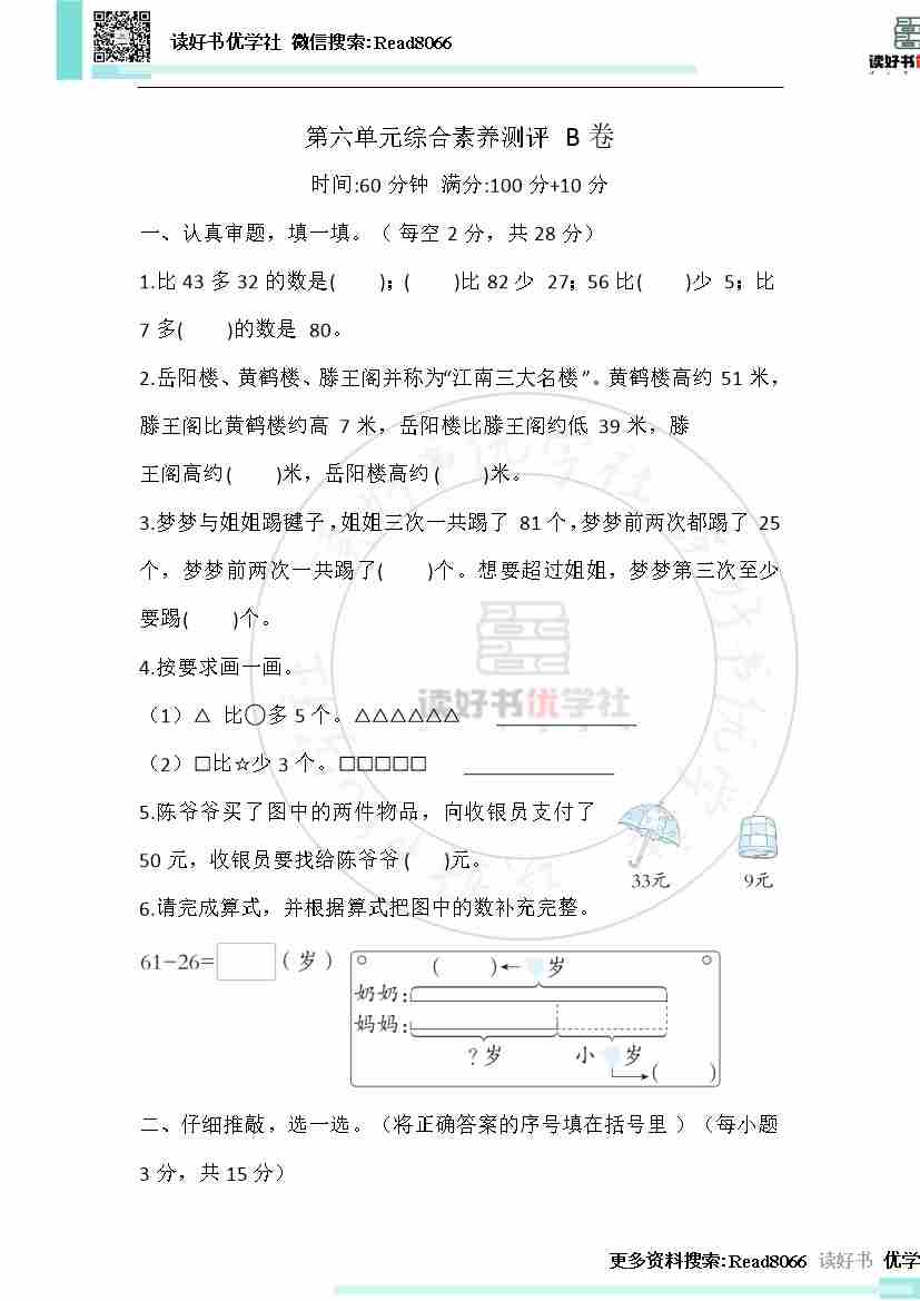 一年级下册第六单元综合素养测评 B卷(含答案)