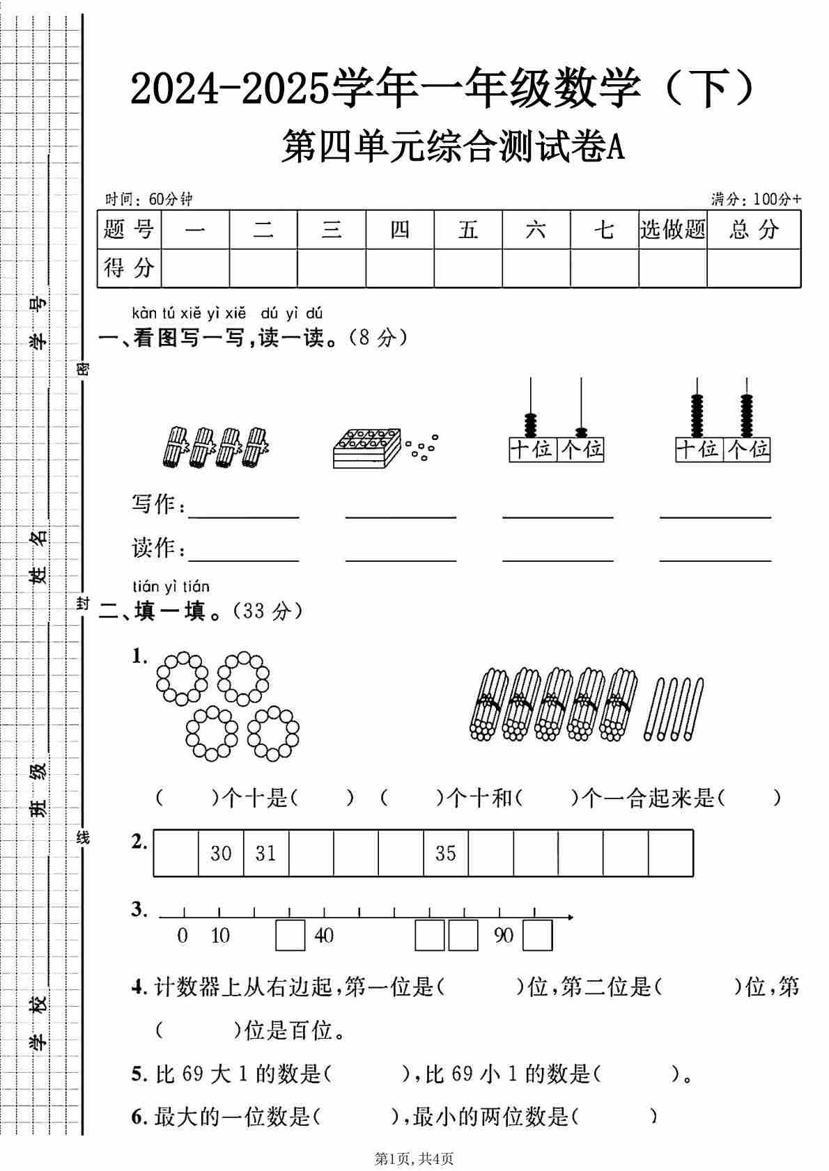 一(下)数学人教版24-25第四单元综合测试A卷