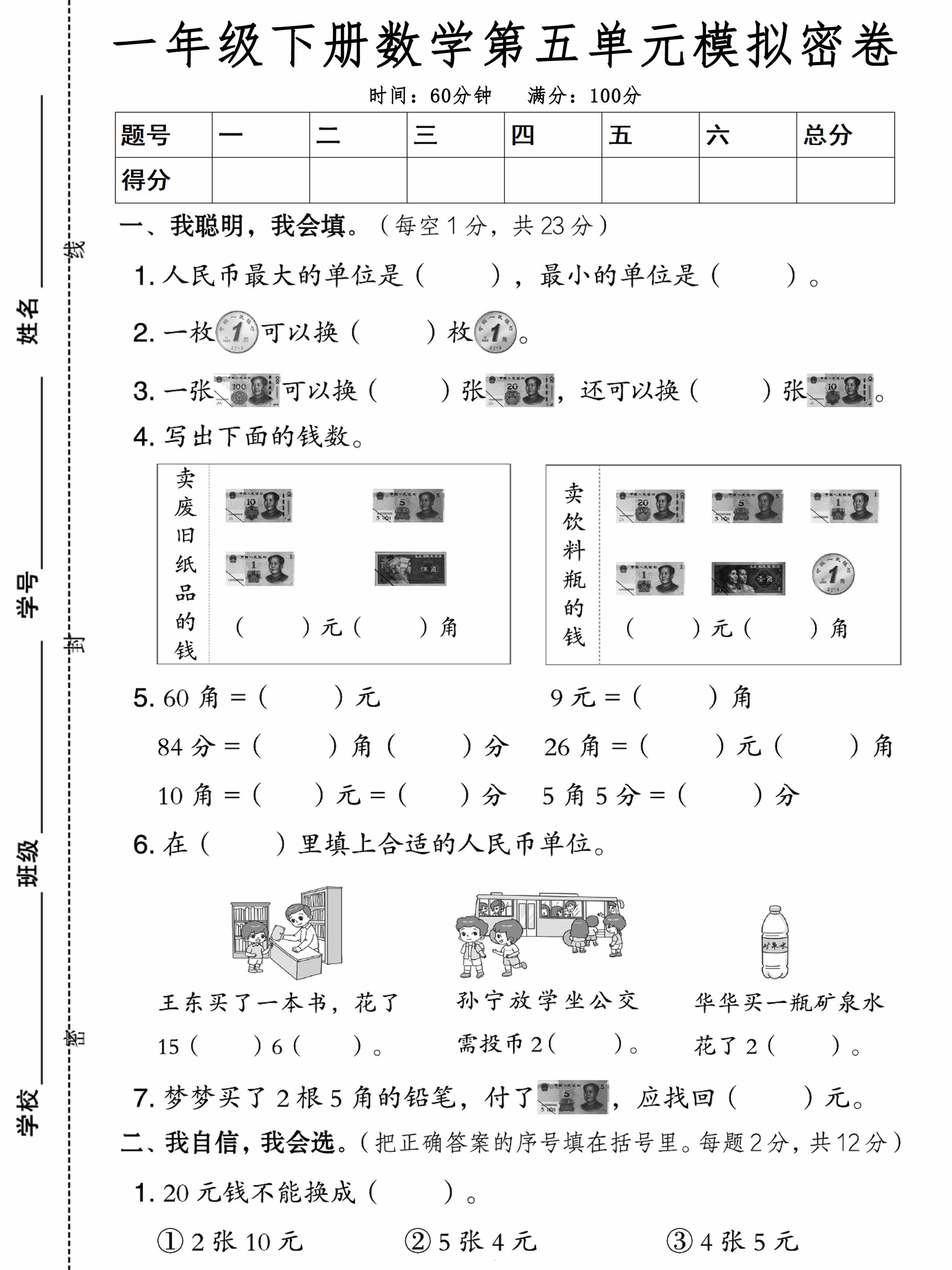 一(下)数学人教版【第五单元模拟密卷】