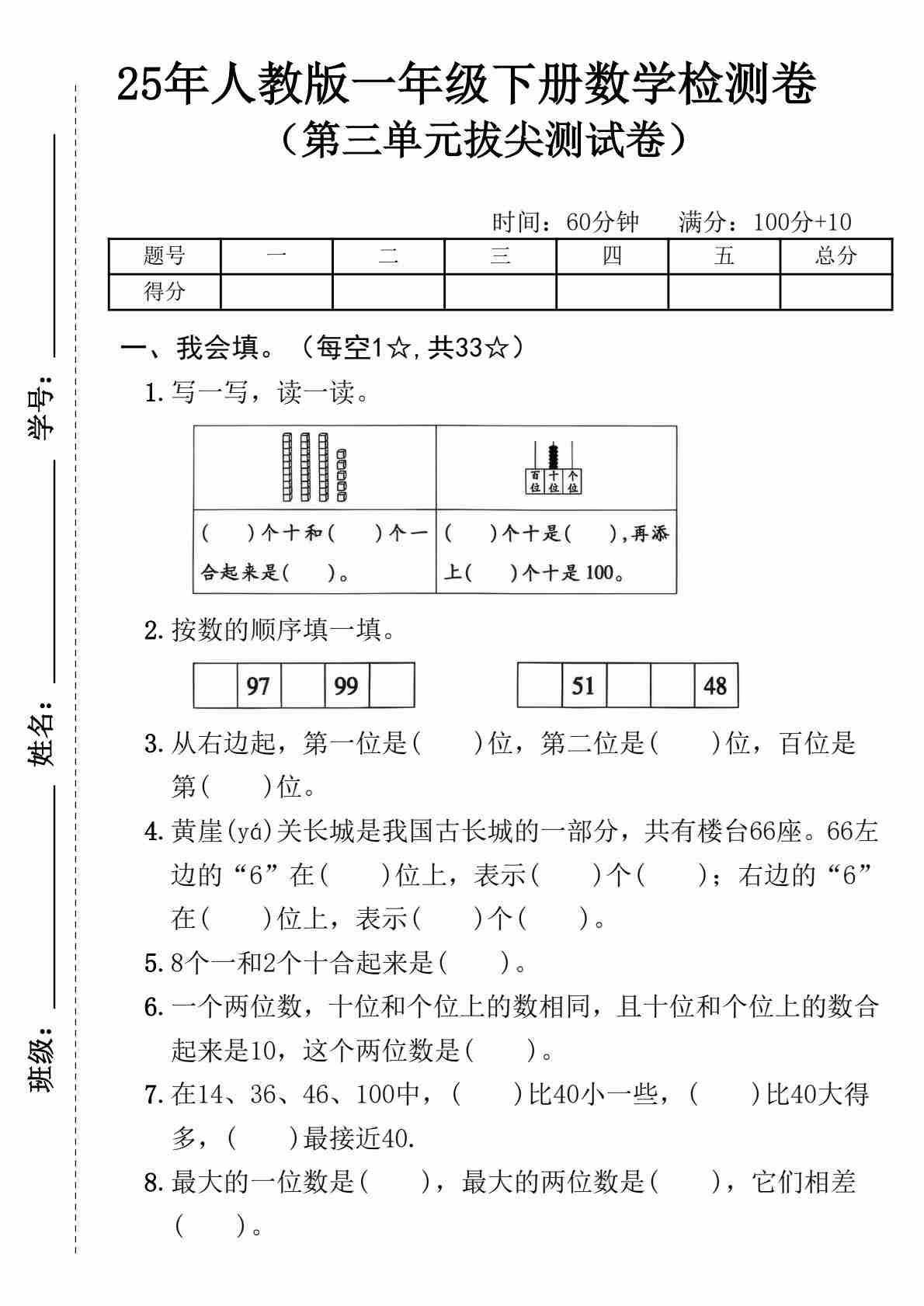 一(下)数学【人教版】25春第三单元测试卷(含答案5页)