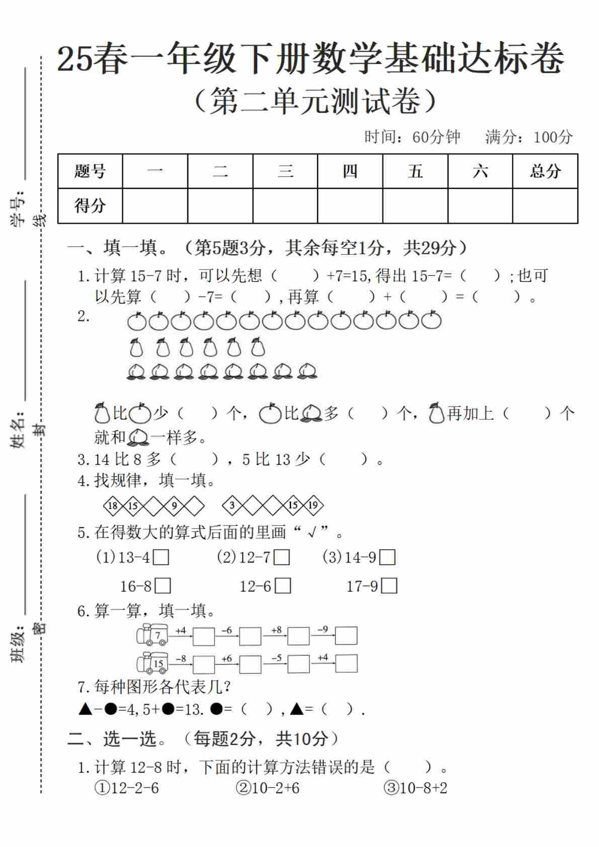 一(下)数学【人教版】25春第二单元基础达标卷--计算15-7