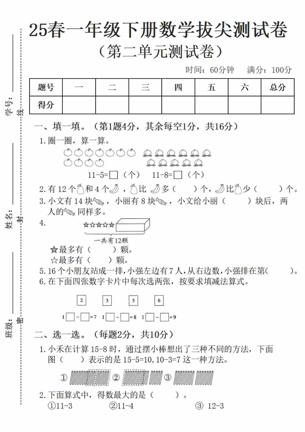 一(下)数学【人教版】25春第二单元拔尖测试卷---11-5