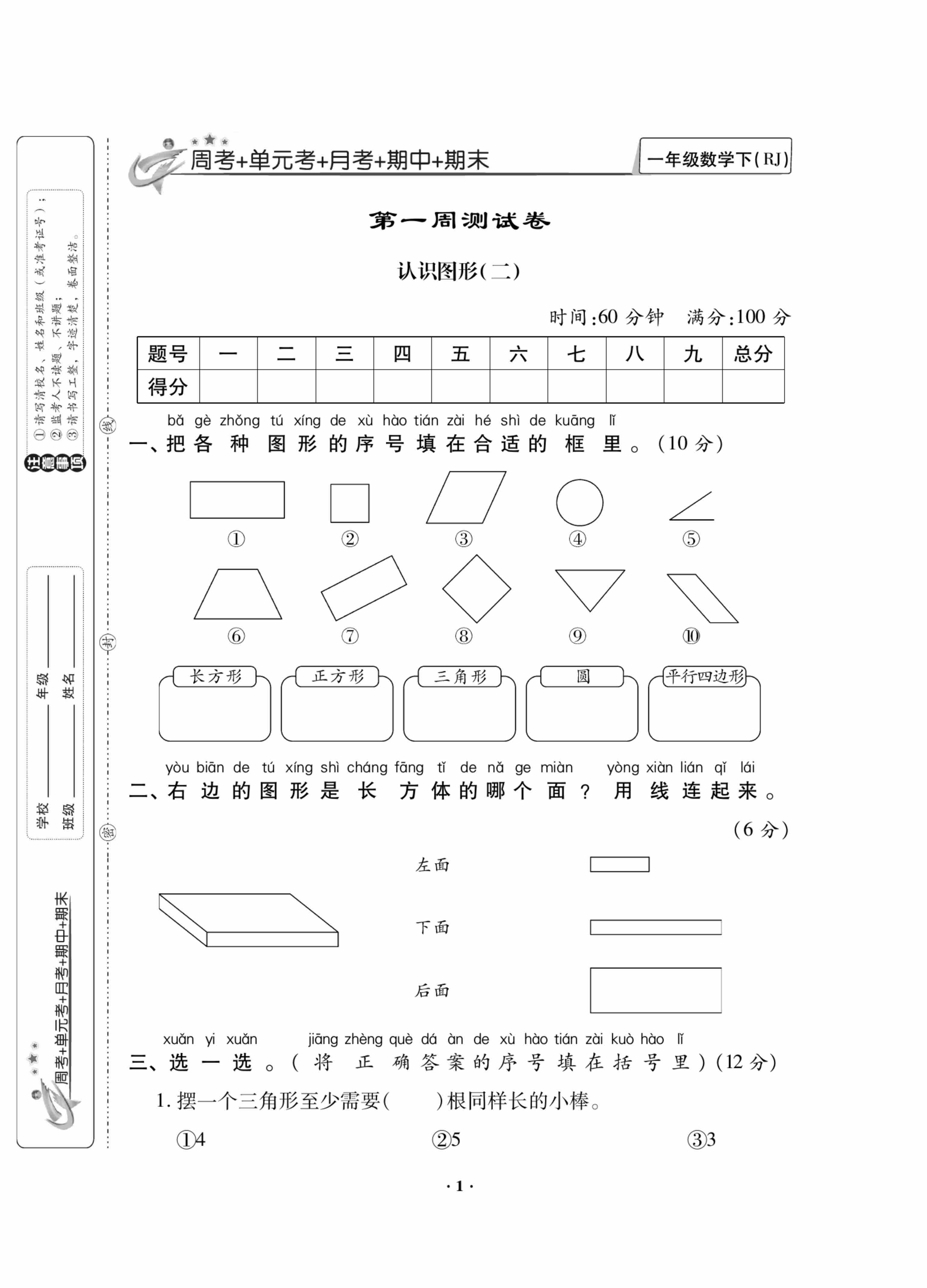 一(下)数学【人教版】2025第一单元拔尖检测卷-把相应图形