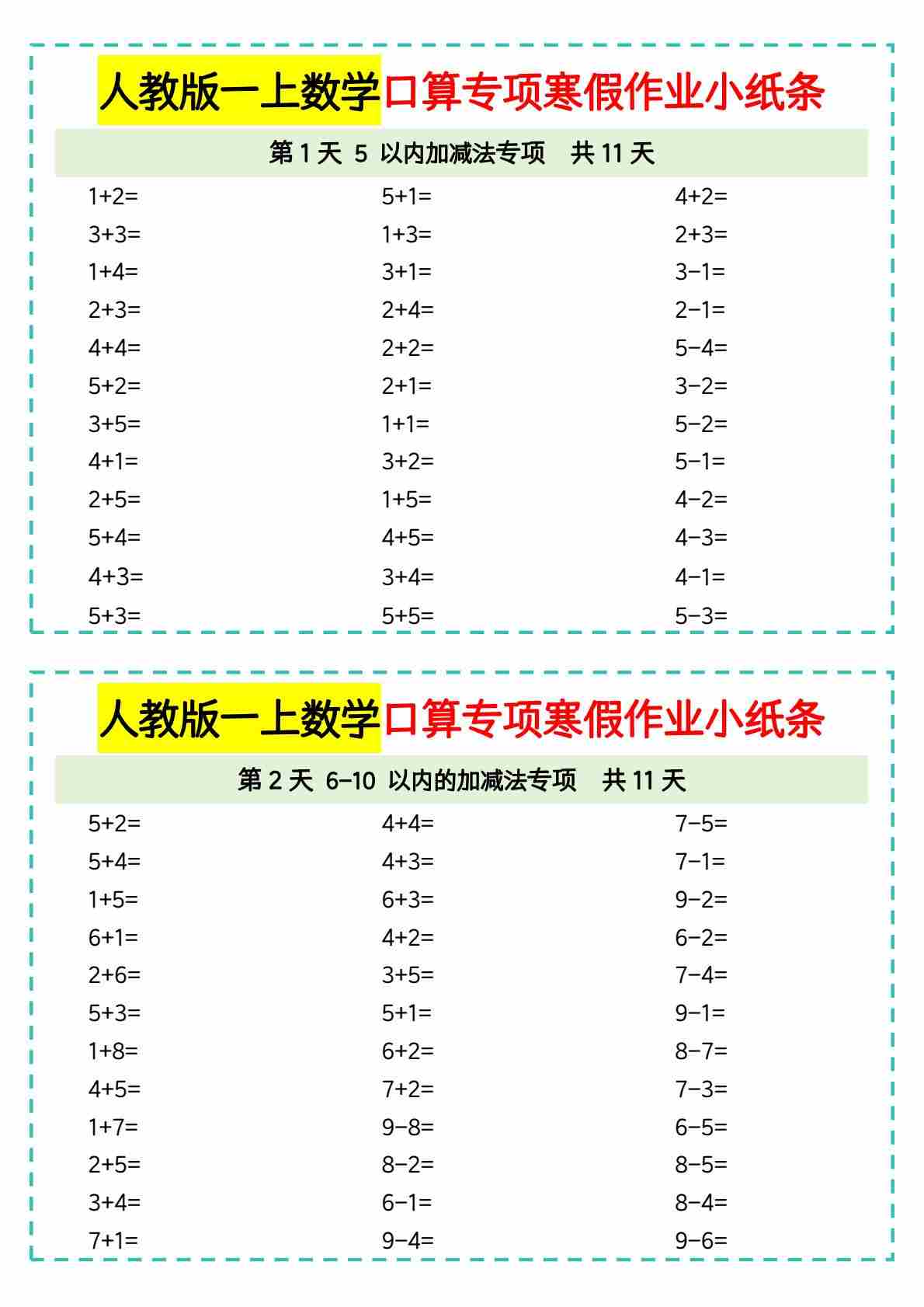 一年级数学人教版口算专项寒假作业小纸条