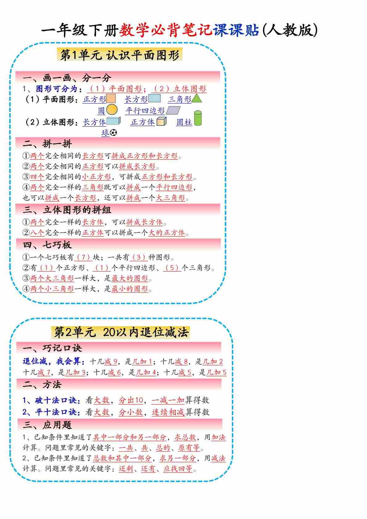 一(下)数学易错(填空+应用题)专项小纸条