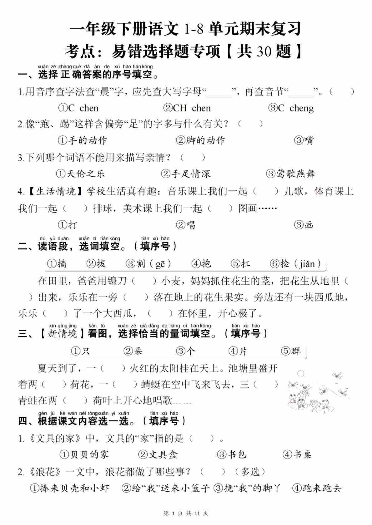 一 (下)语文【期末复习考点:1-8单元易错选择题专项(共30题)含答案11页】
