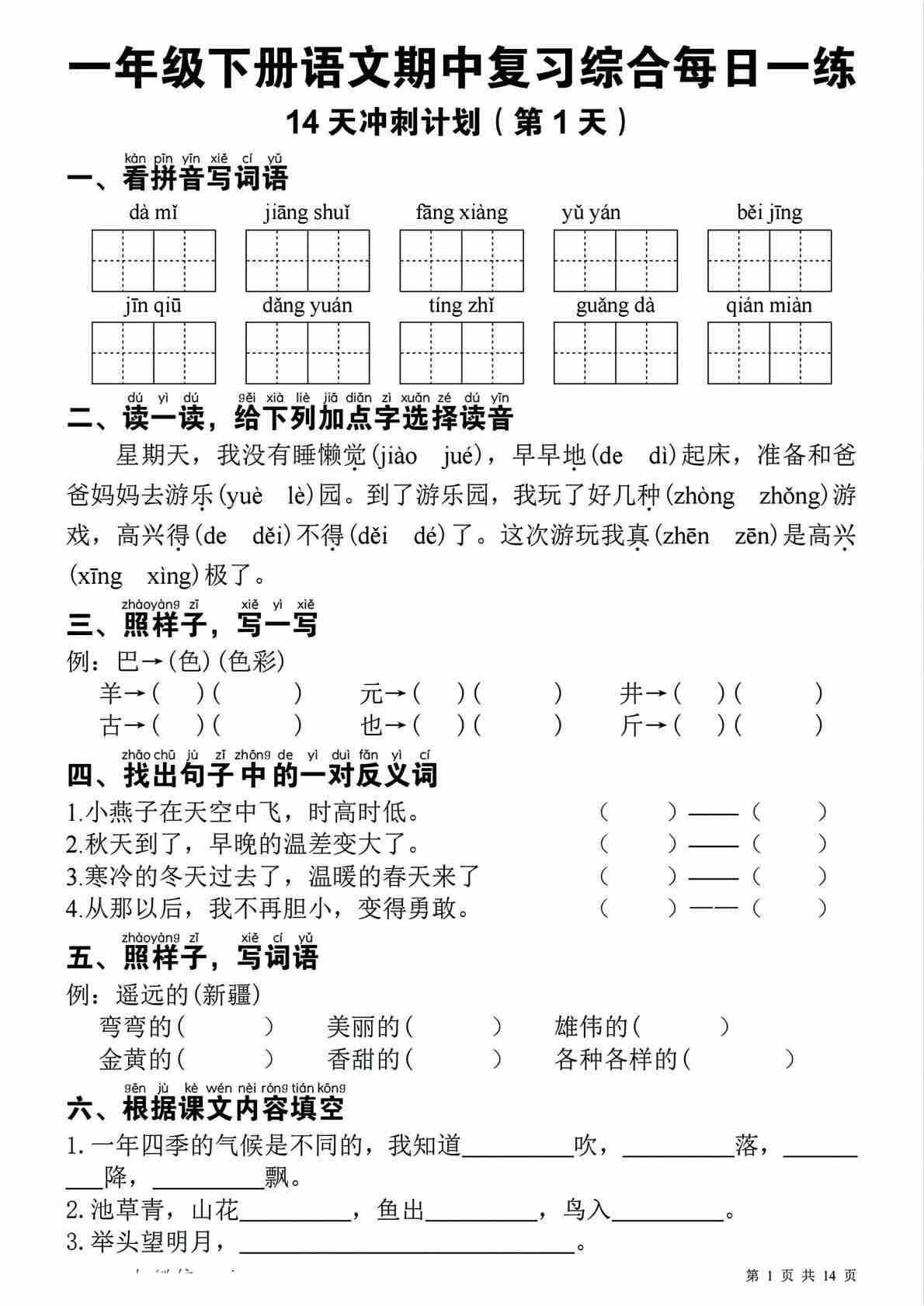 一(下)语文期中复习综合每日一练14天冲刺(含答案23页)