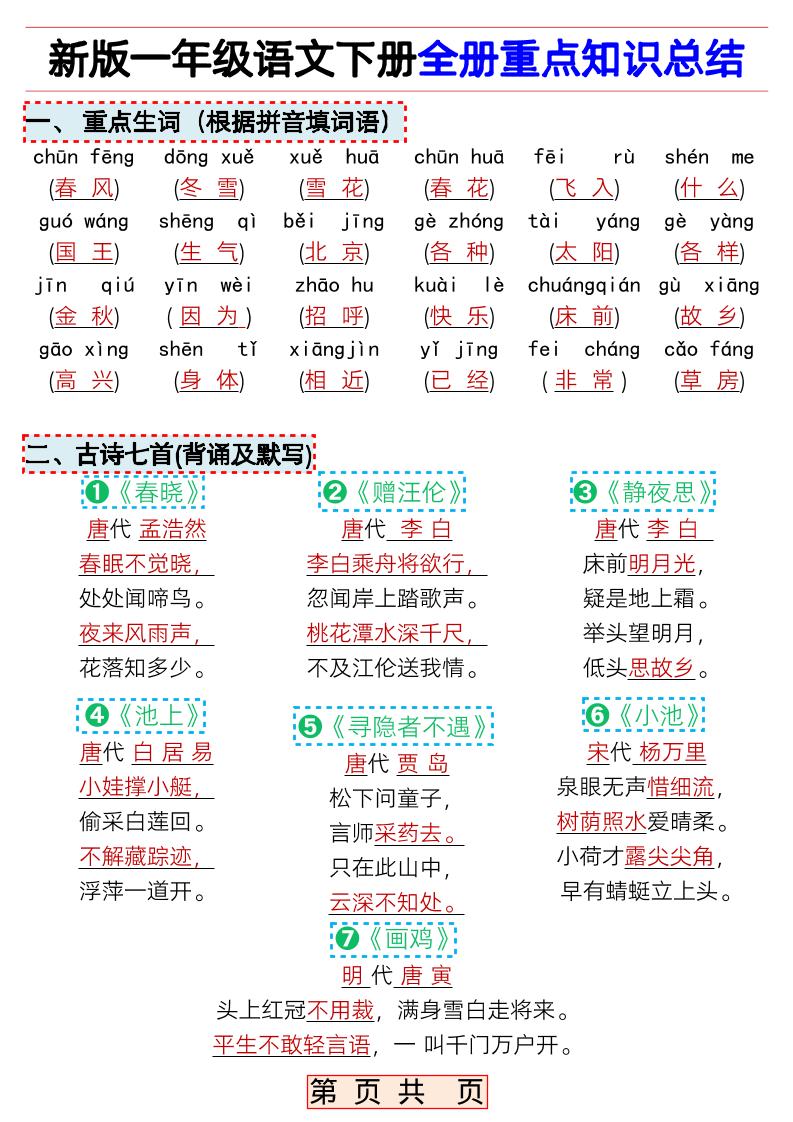 一(下)语文 全册重点知识总结(后面是空白版练习)