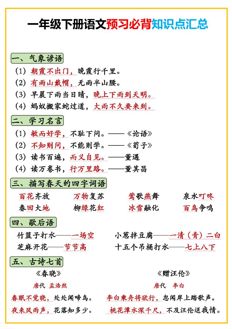 一(下)语文 预习背诵:课文背诵337法+课文内容填空