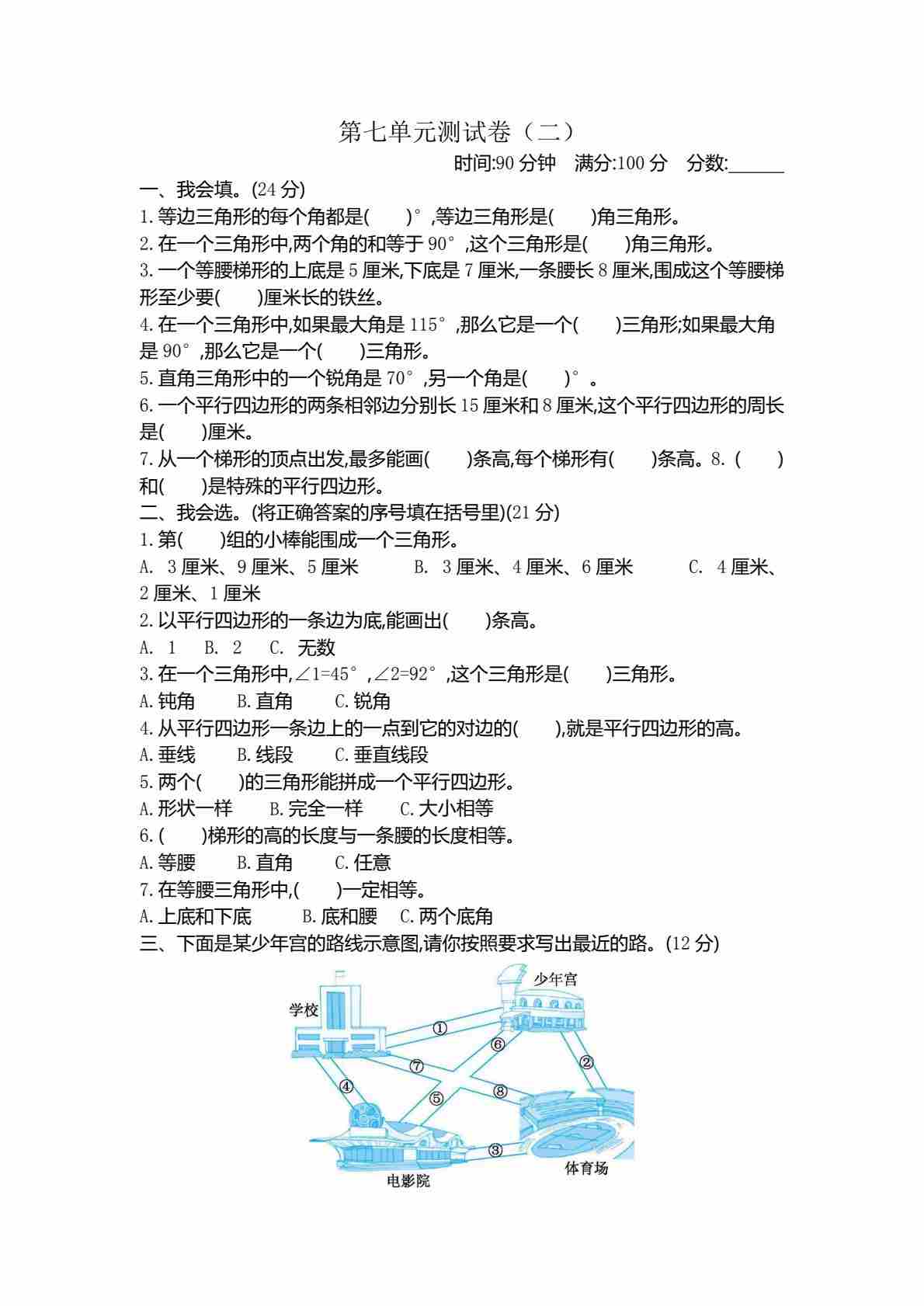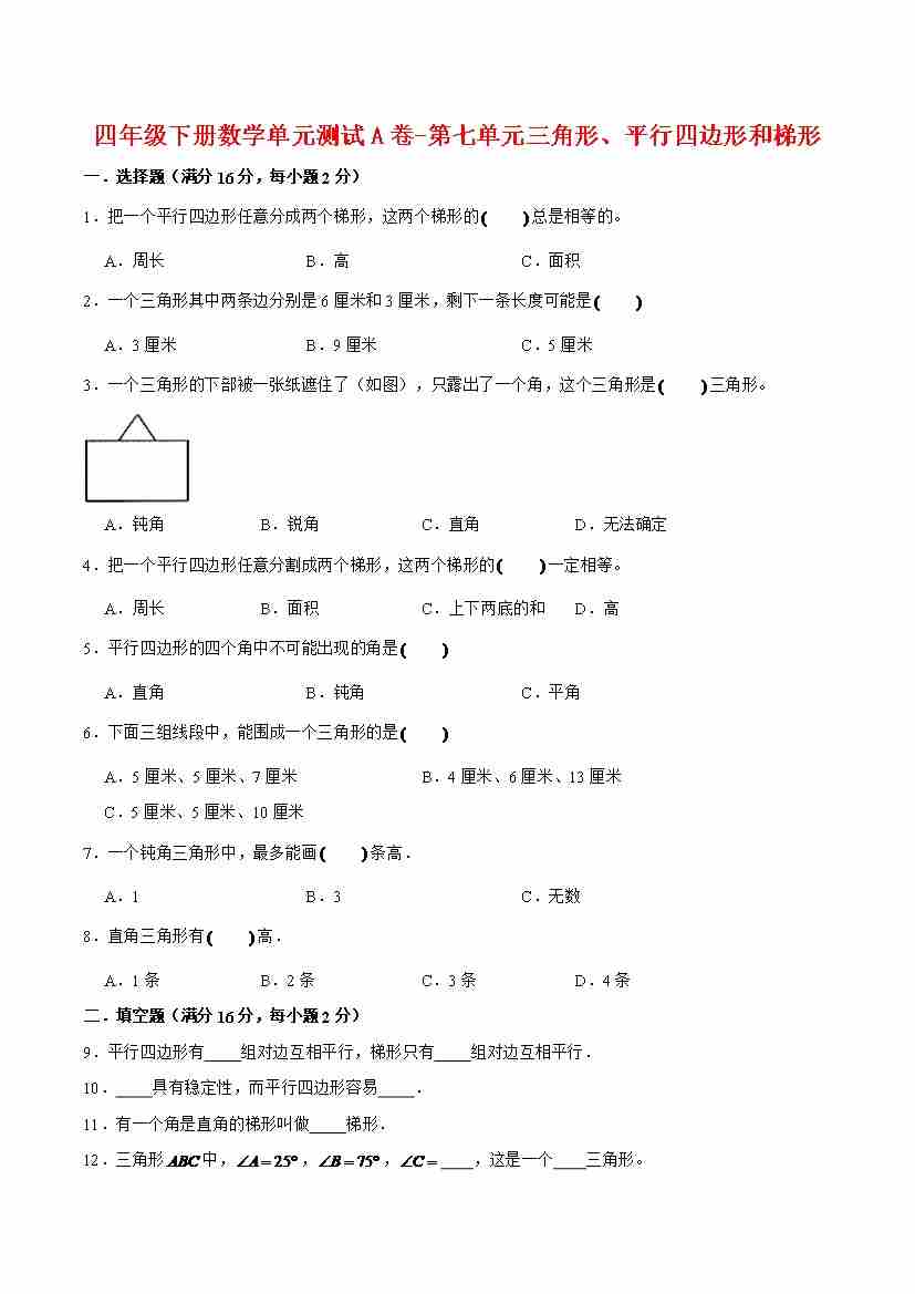 【单元AB卷】四年级下册数学单元测试A卷-第七单元三角形、平行四边形和梯形 苏教版(含答案)