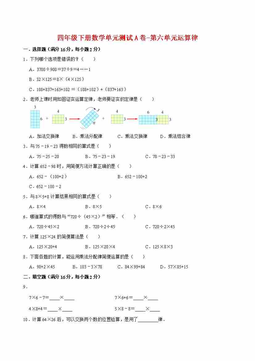 【单元AB卷】四年级下册数学单元测试A卷-第六单元运算律 苏教版(含答案)