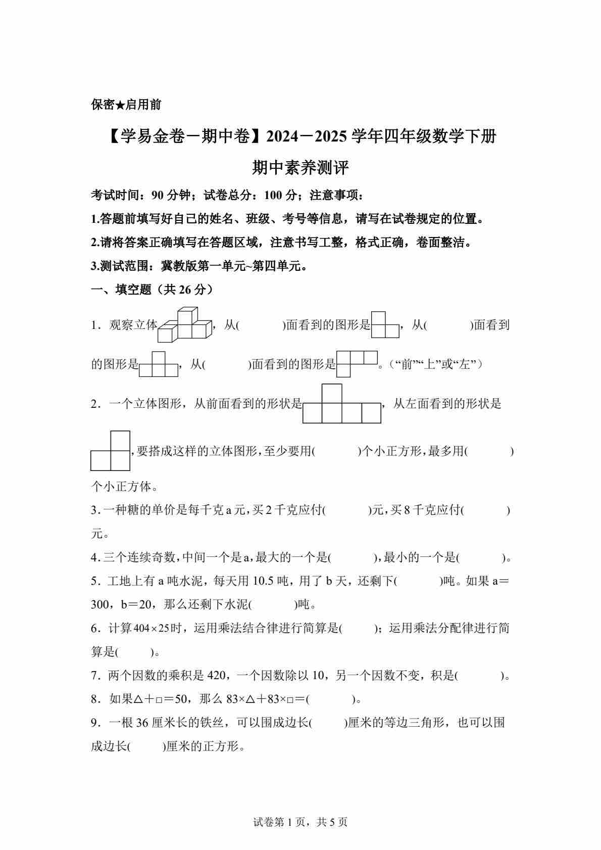四下冀教版数学【2024-2025学年期中素养测评试卷(基础卷)】