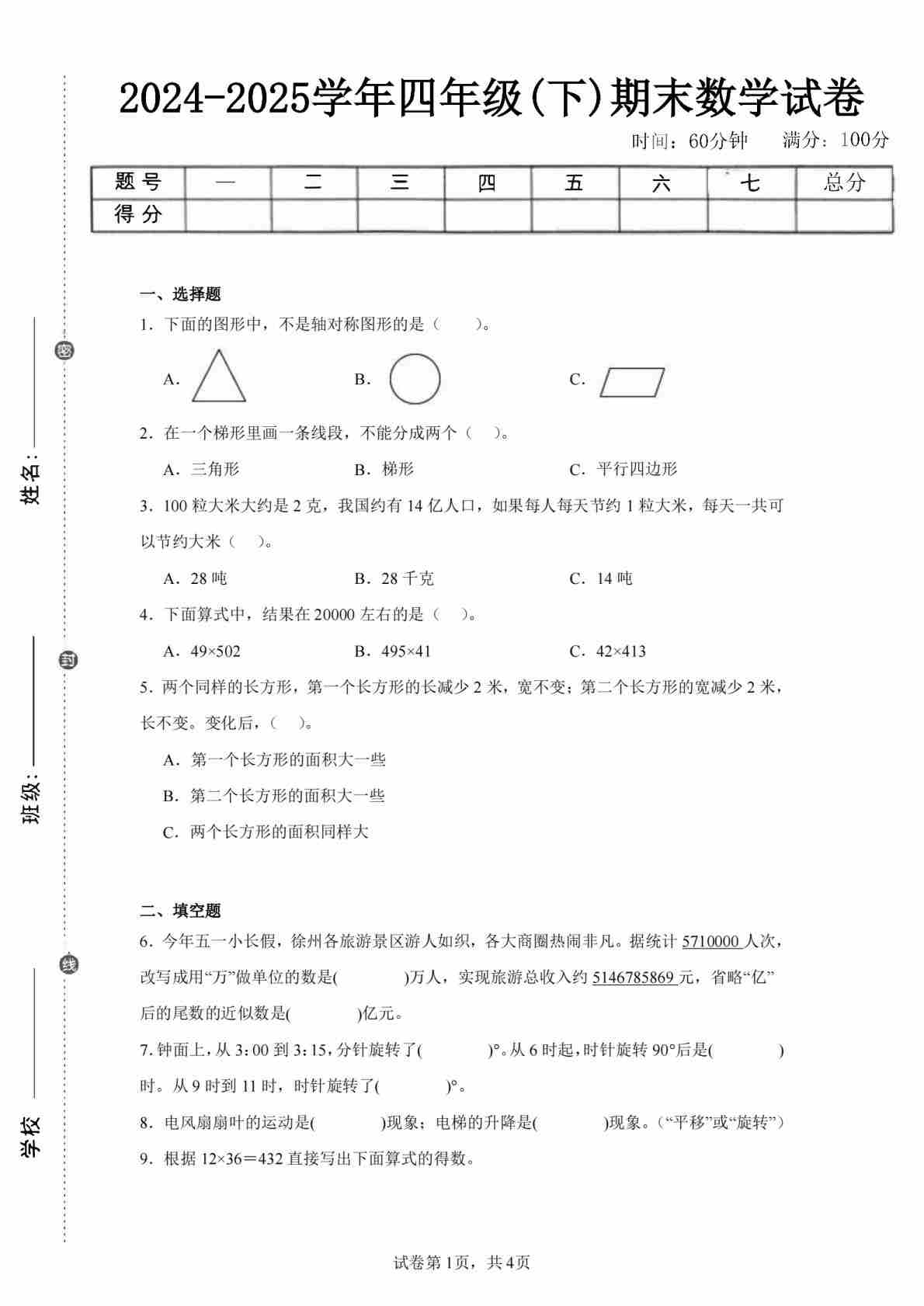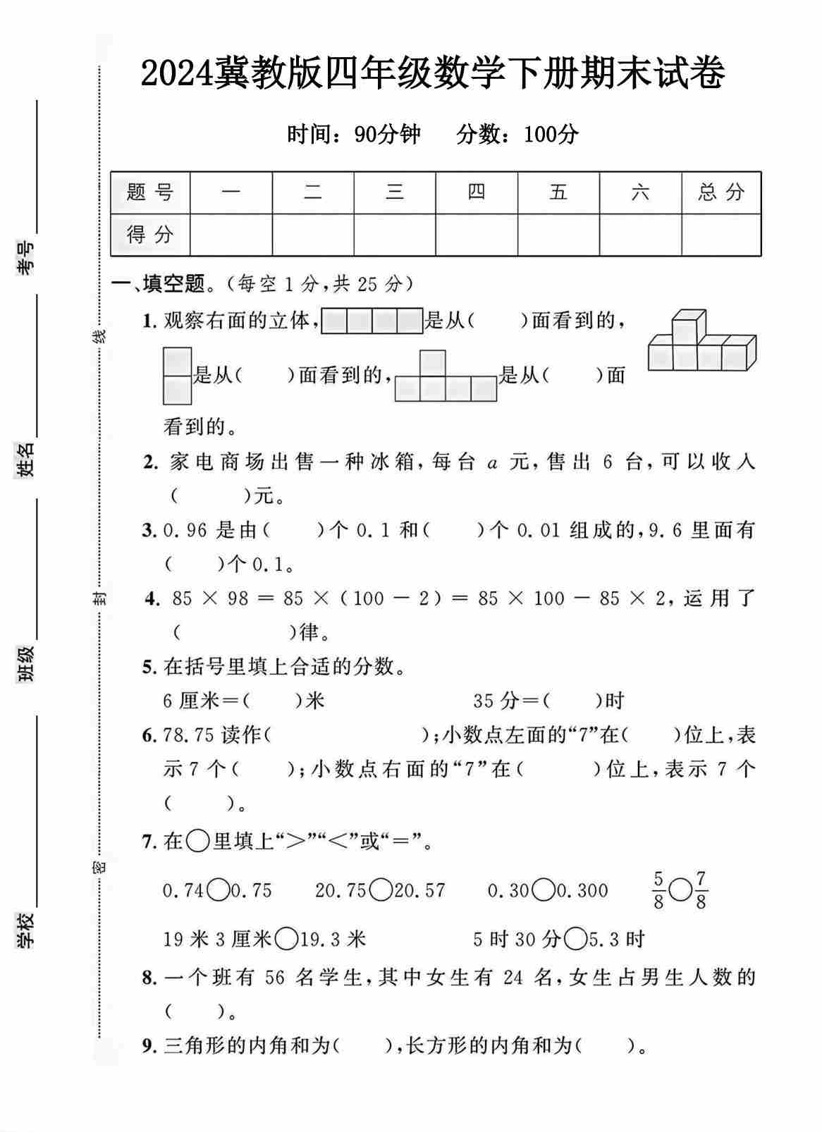 四(下)数学翼教版【2024冀教版】期末试卷1