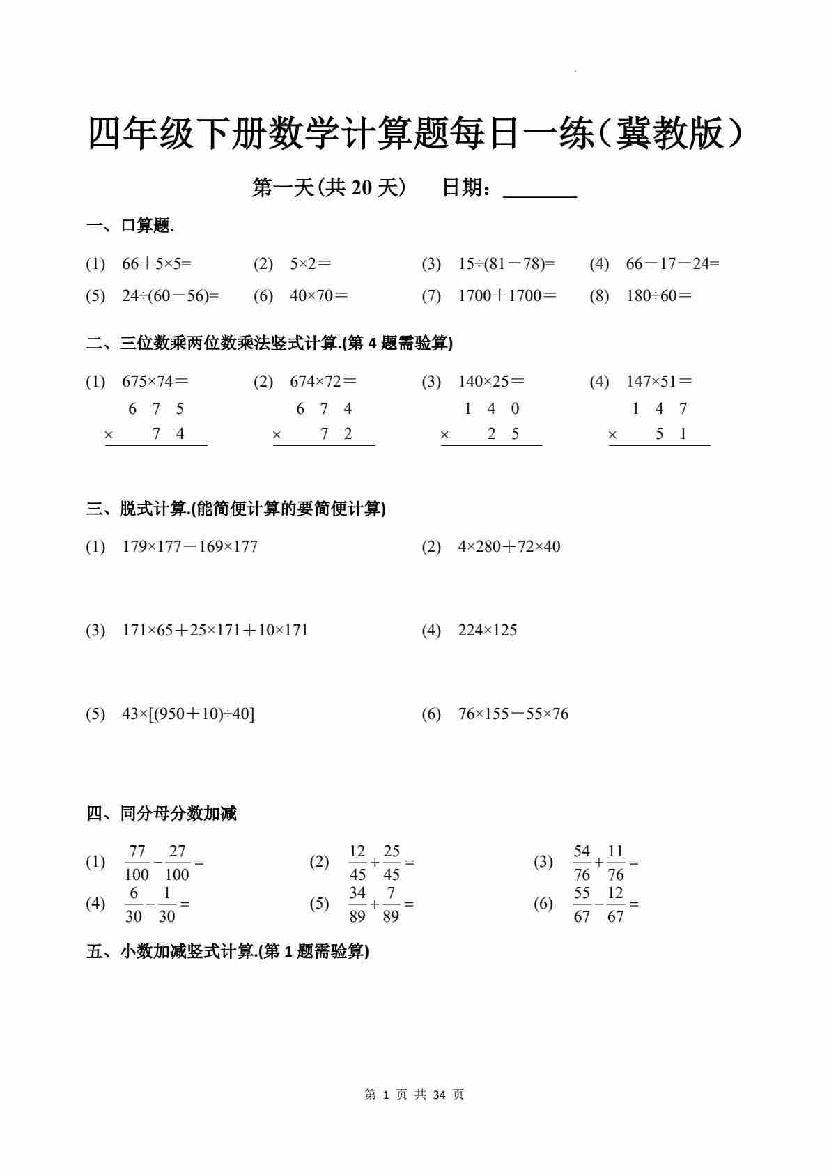 四(下)数学冀教版【计算题每日一练(共20天)】