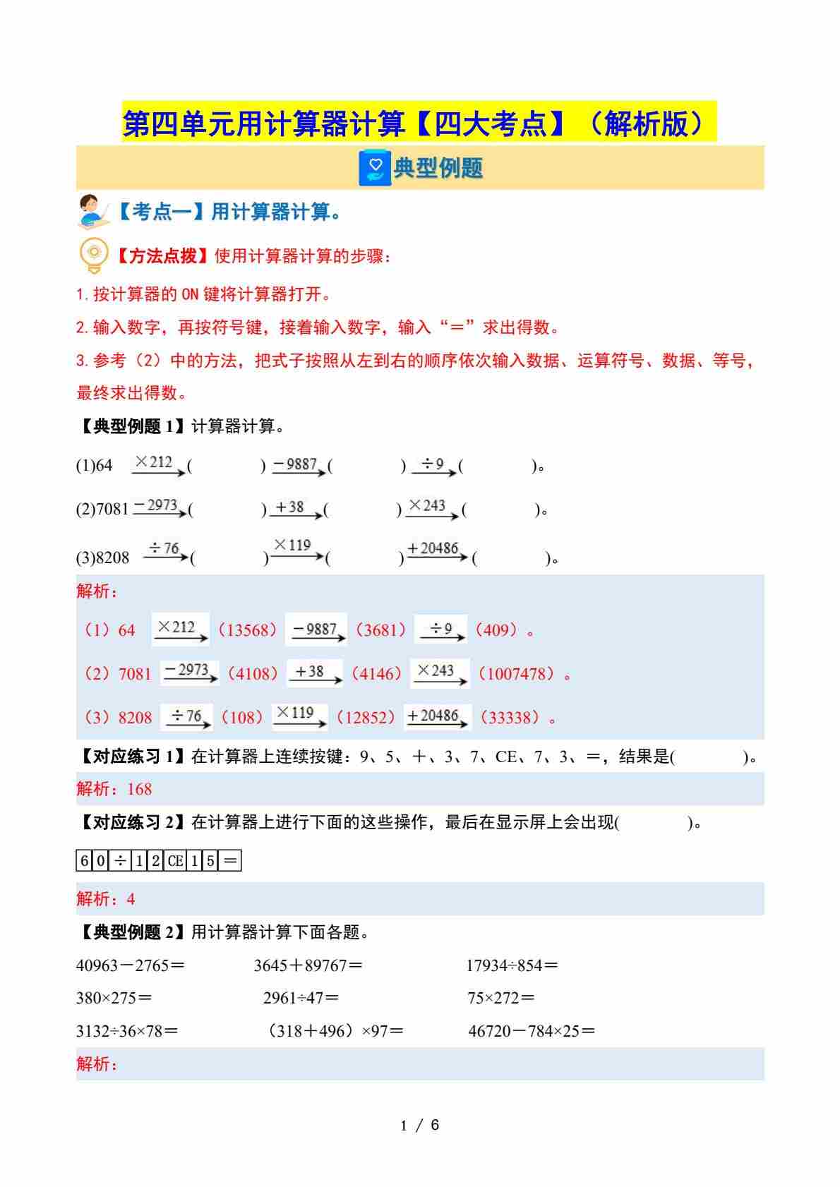 四(下)苏教版数学【第四单元用计算器计算【四大考点】(解析版)】
